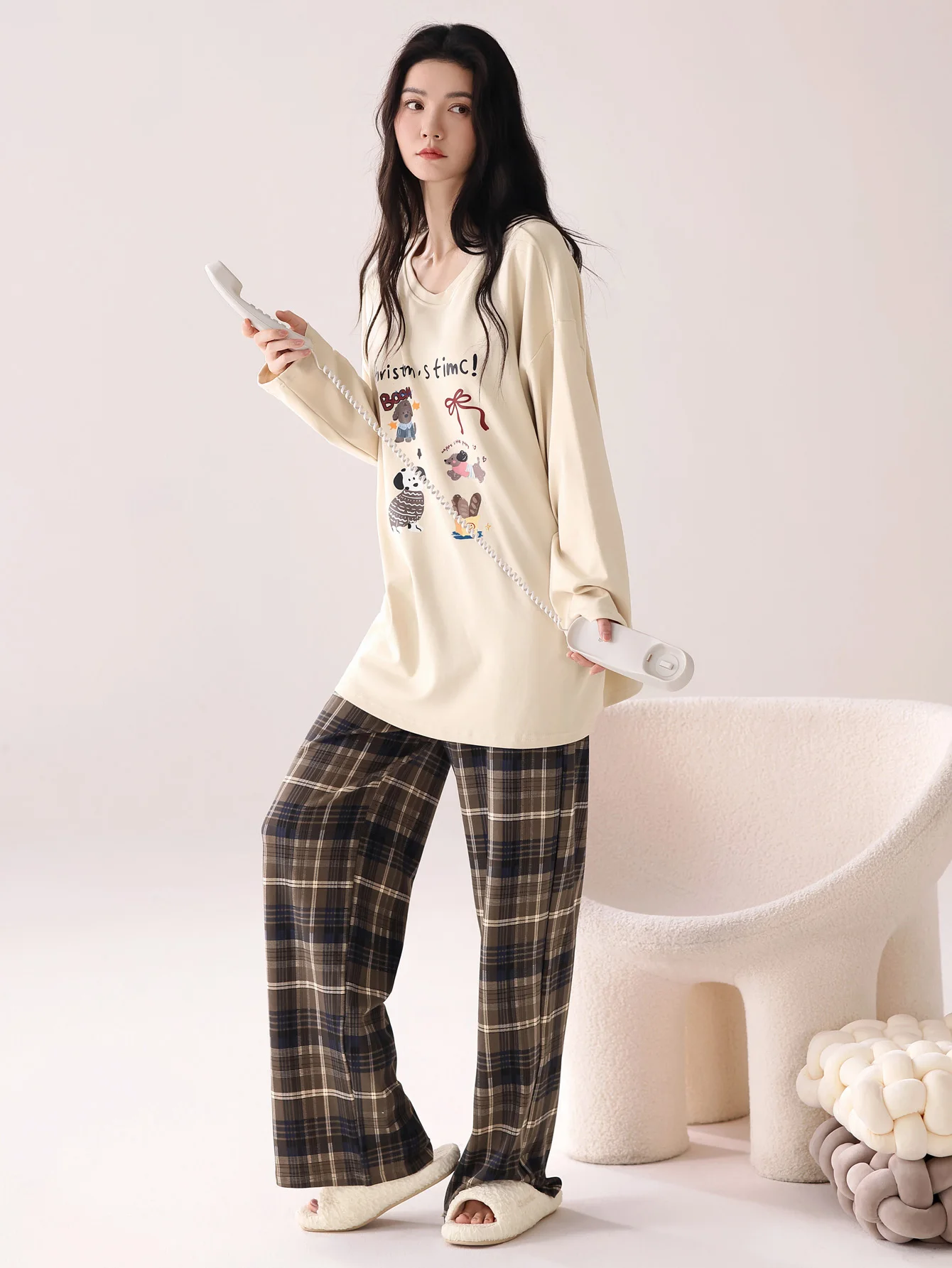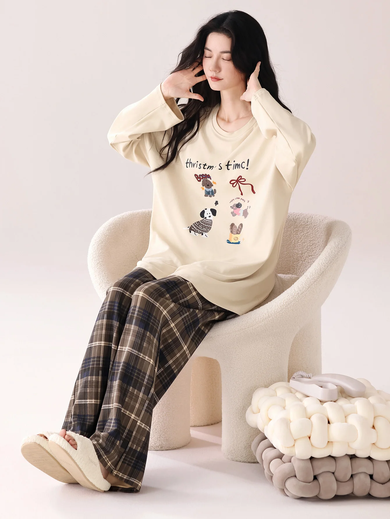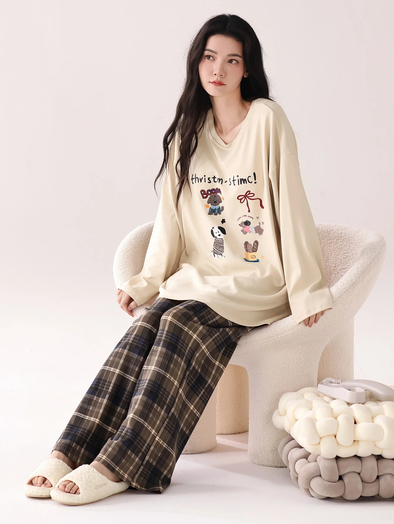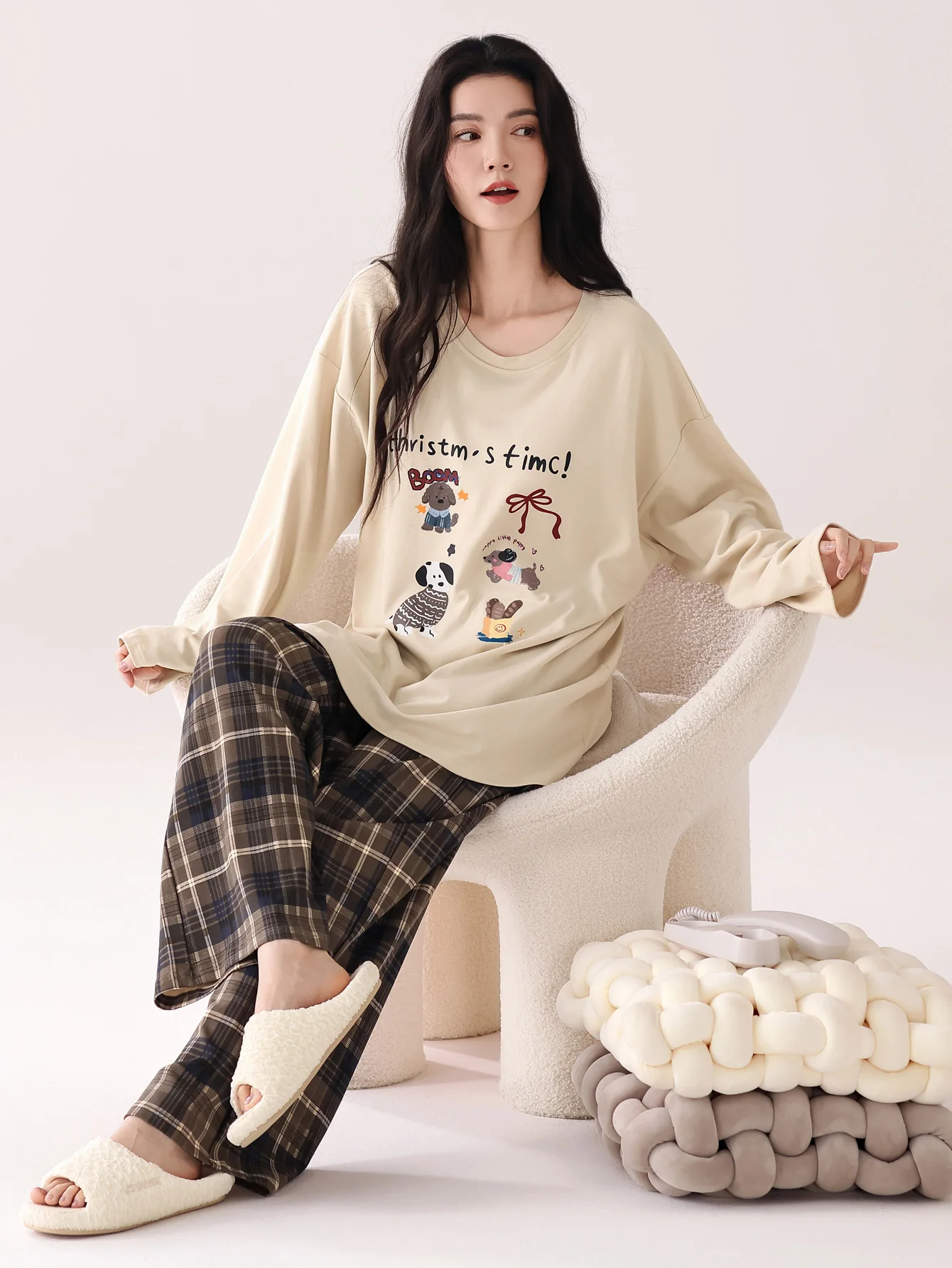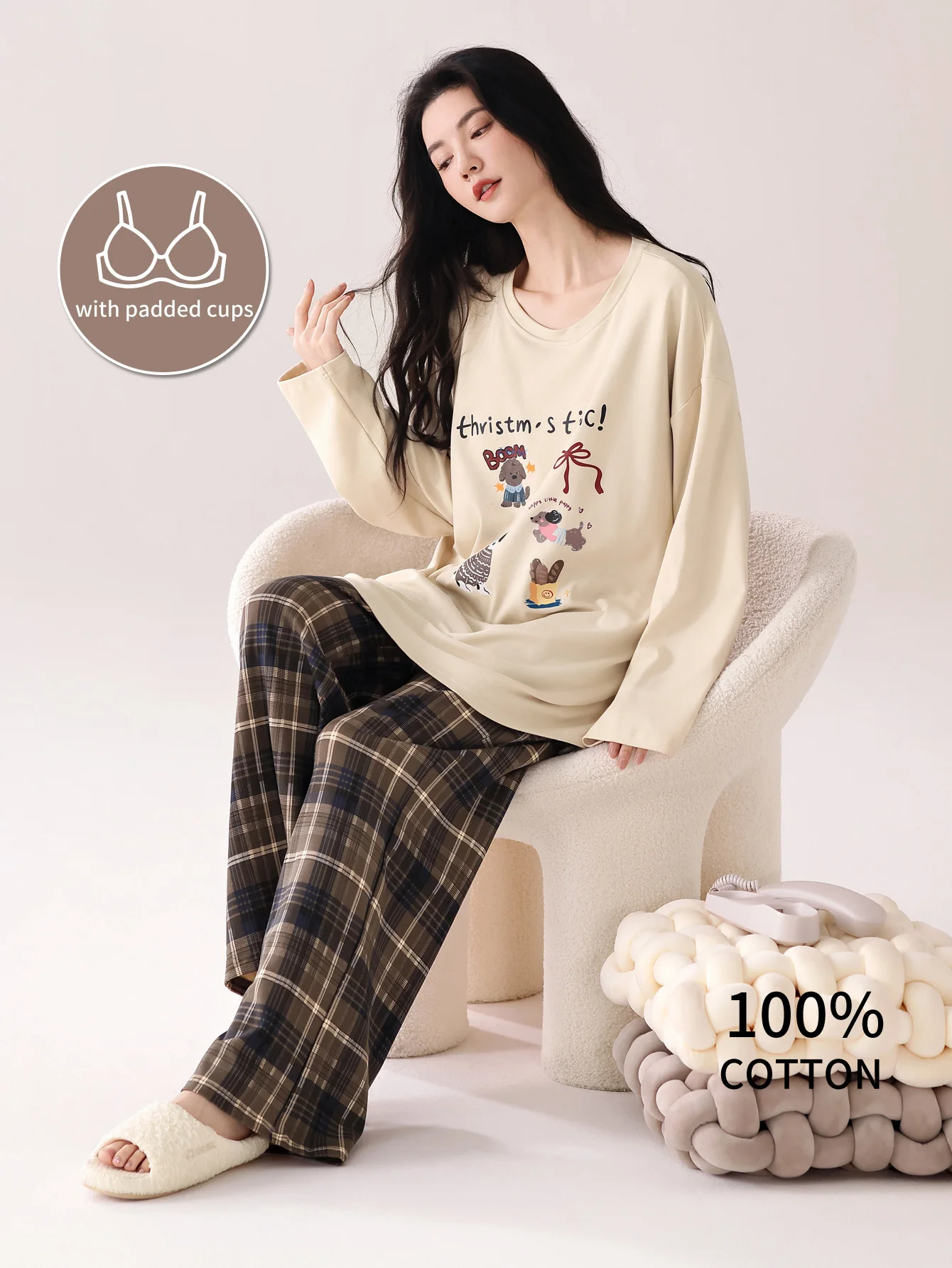 100% Pure Cotton Sleepwear with Chest Cushion, Autumn and Winter Women’s Long-Sleeved Pants, Pure Cotton Plus Size Women’s Loungewear