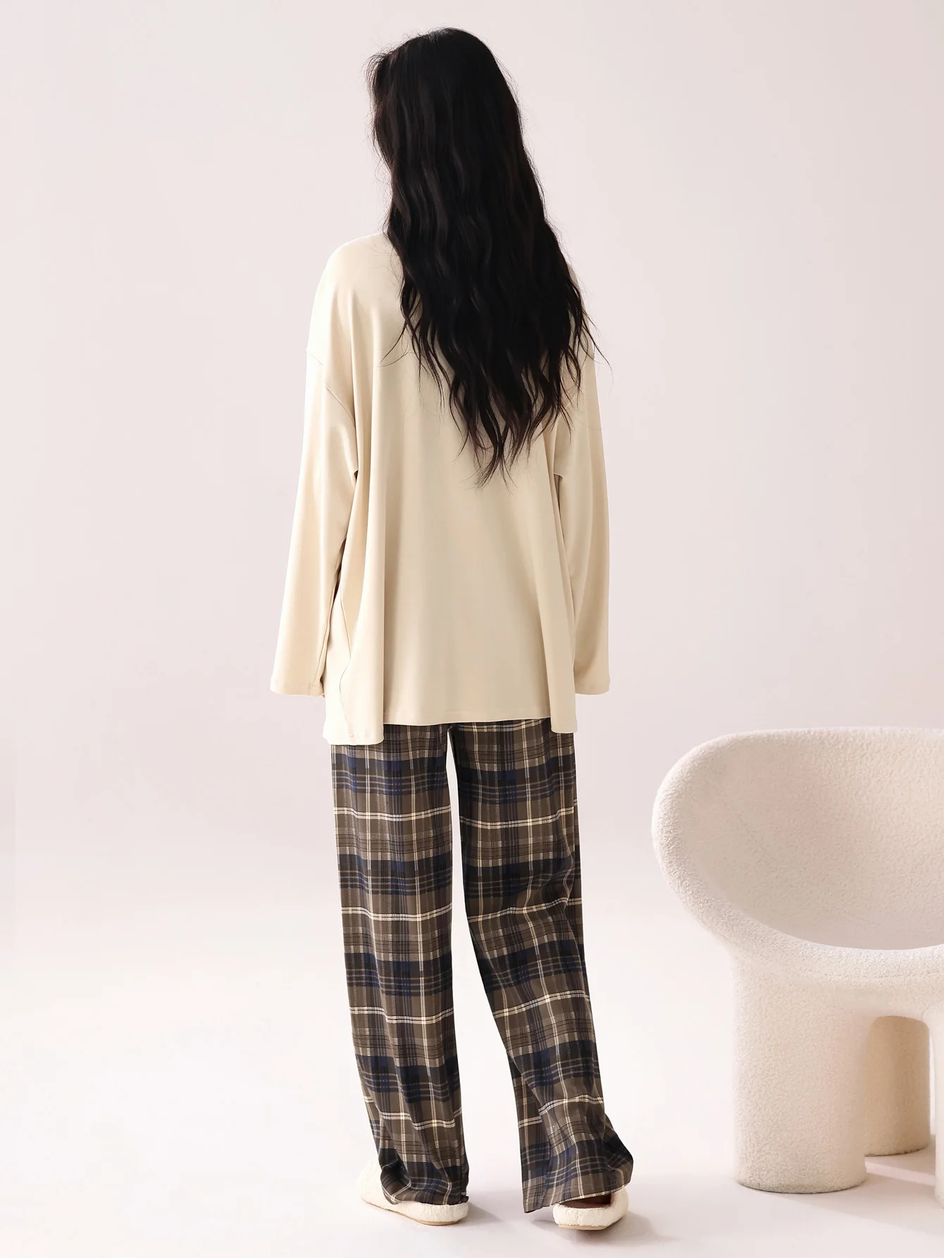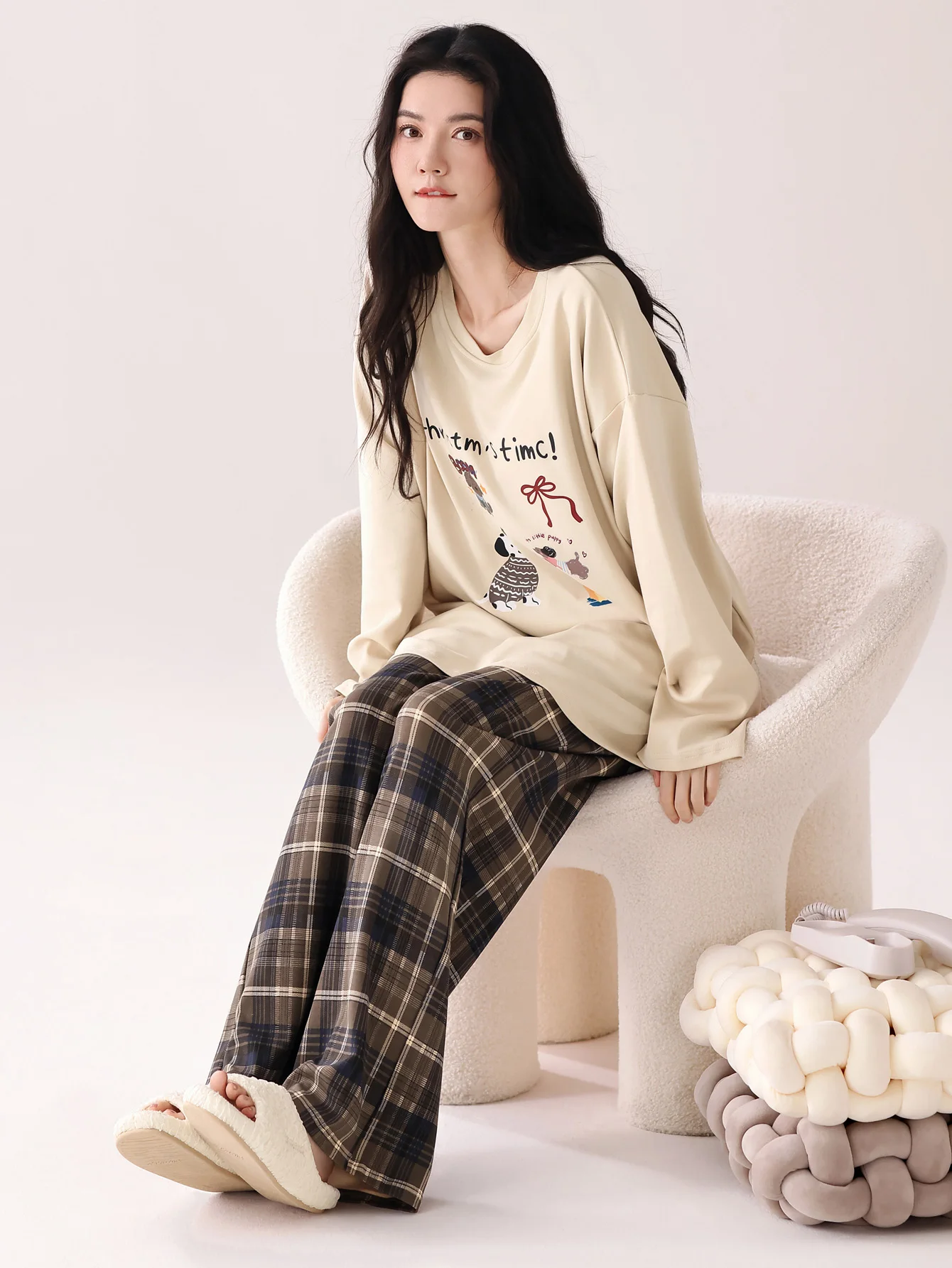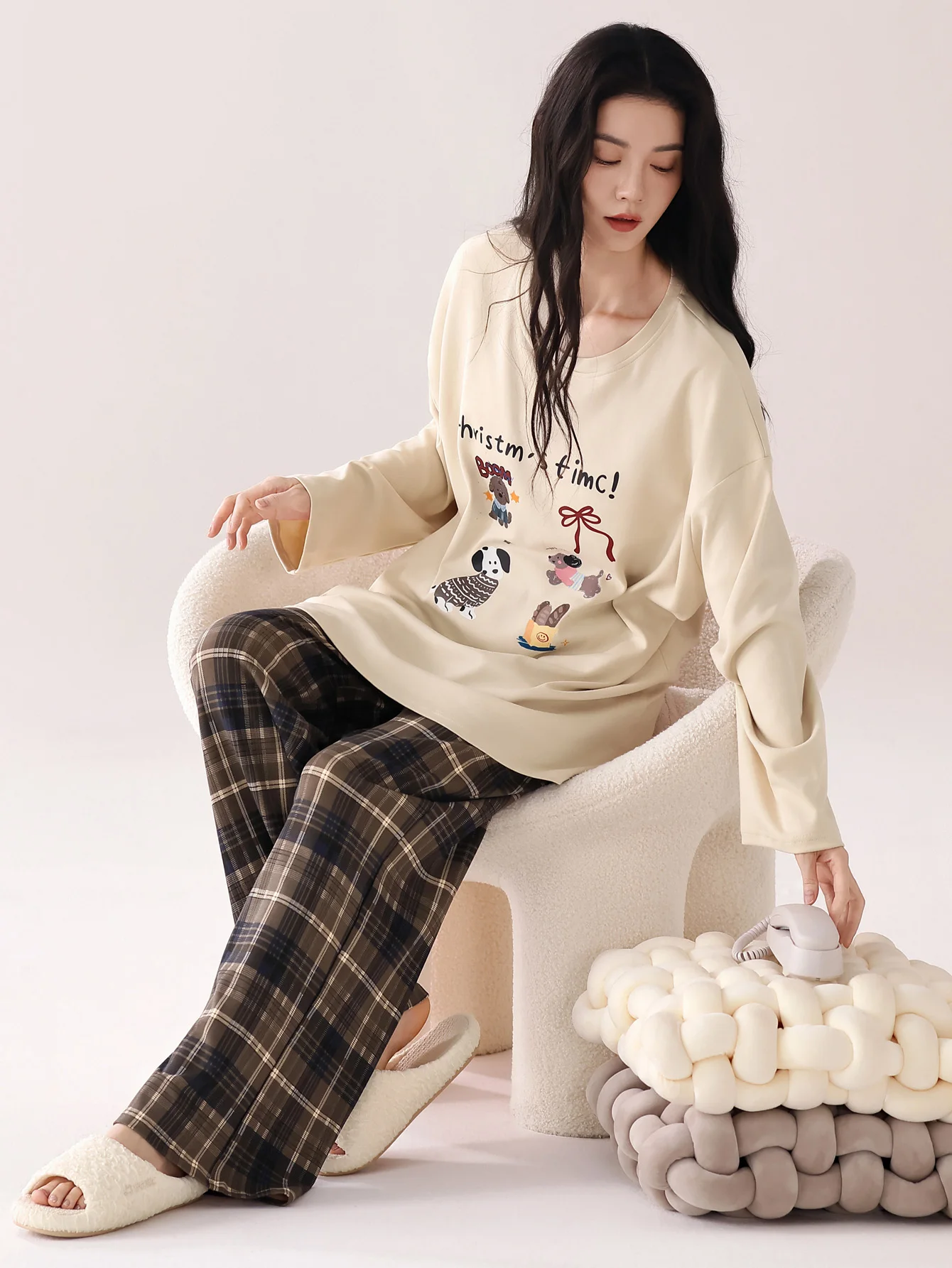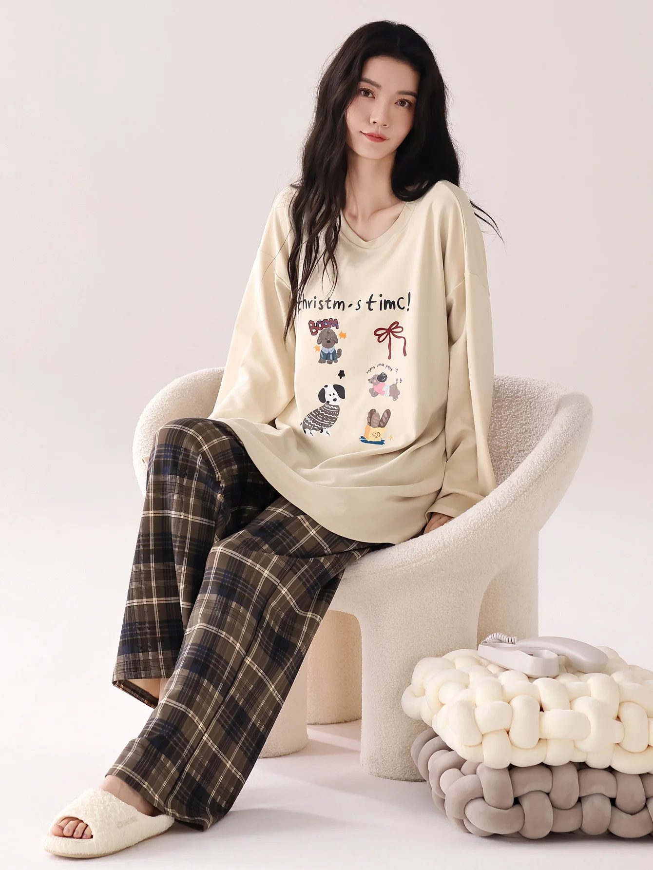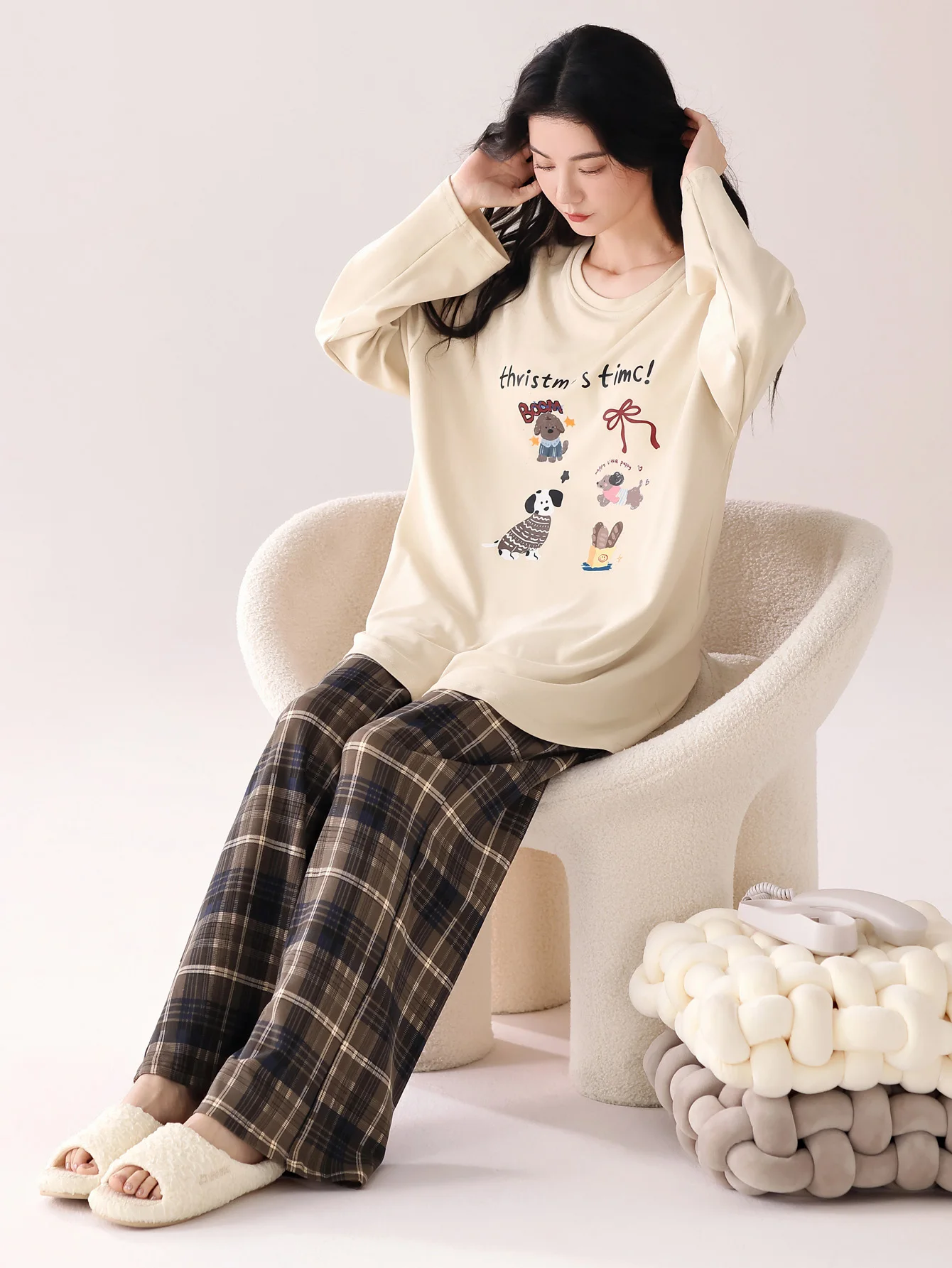 100% Pure Cotton Sleepwear with Chest Cushion, Autumn and Winter Women’s Long-Sleeved Pants, Pure Cotton Plus Size Women’s Loungewear