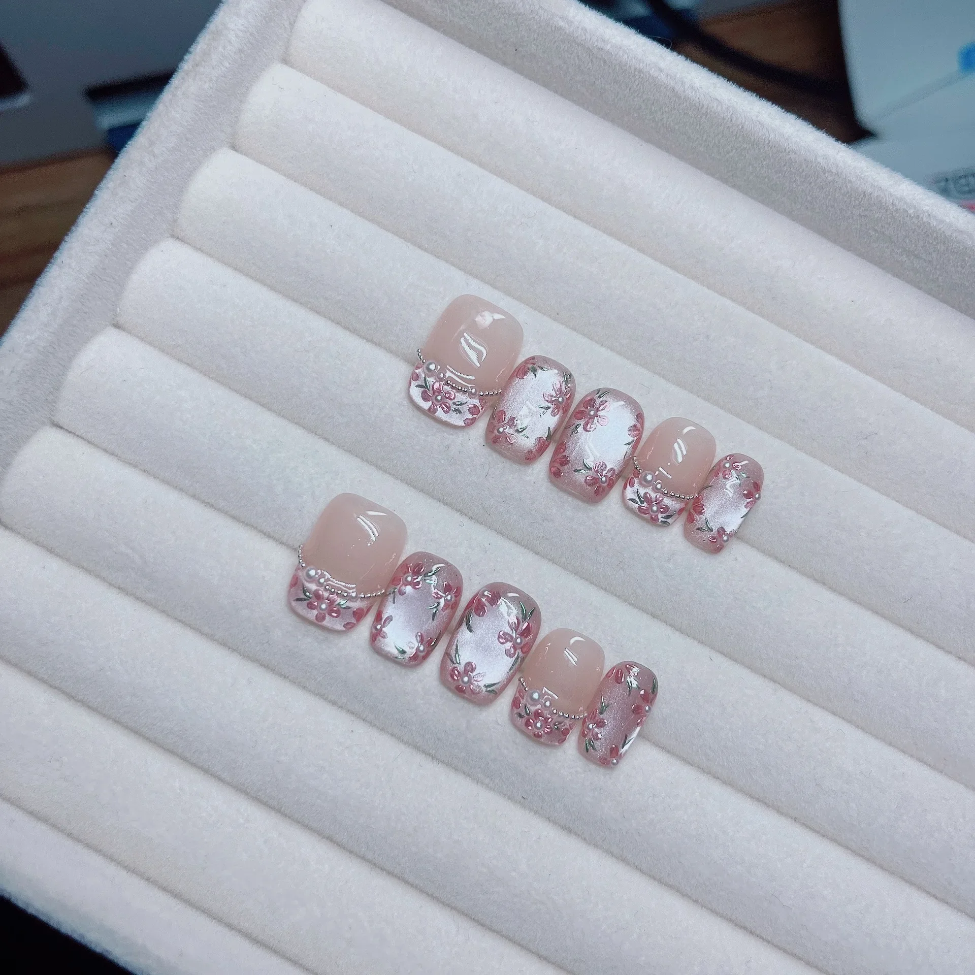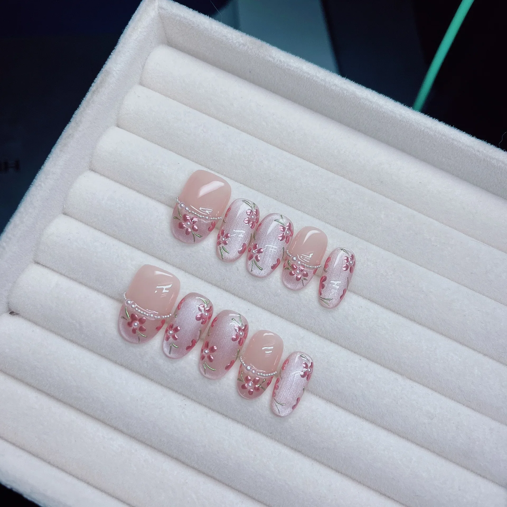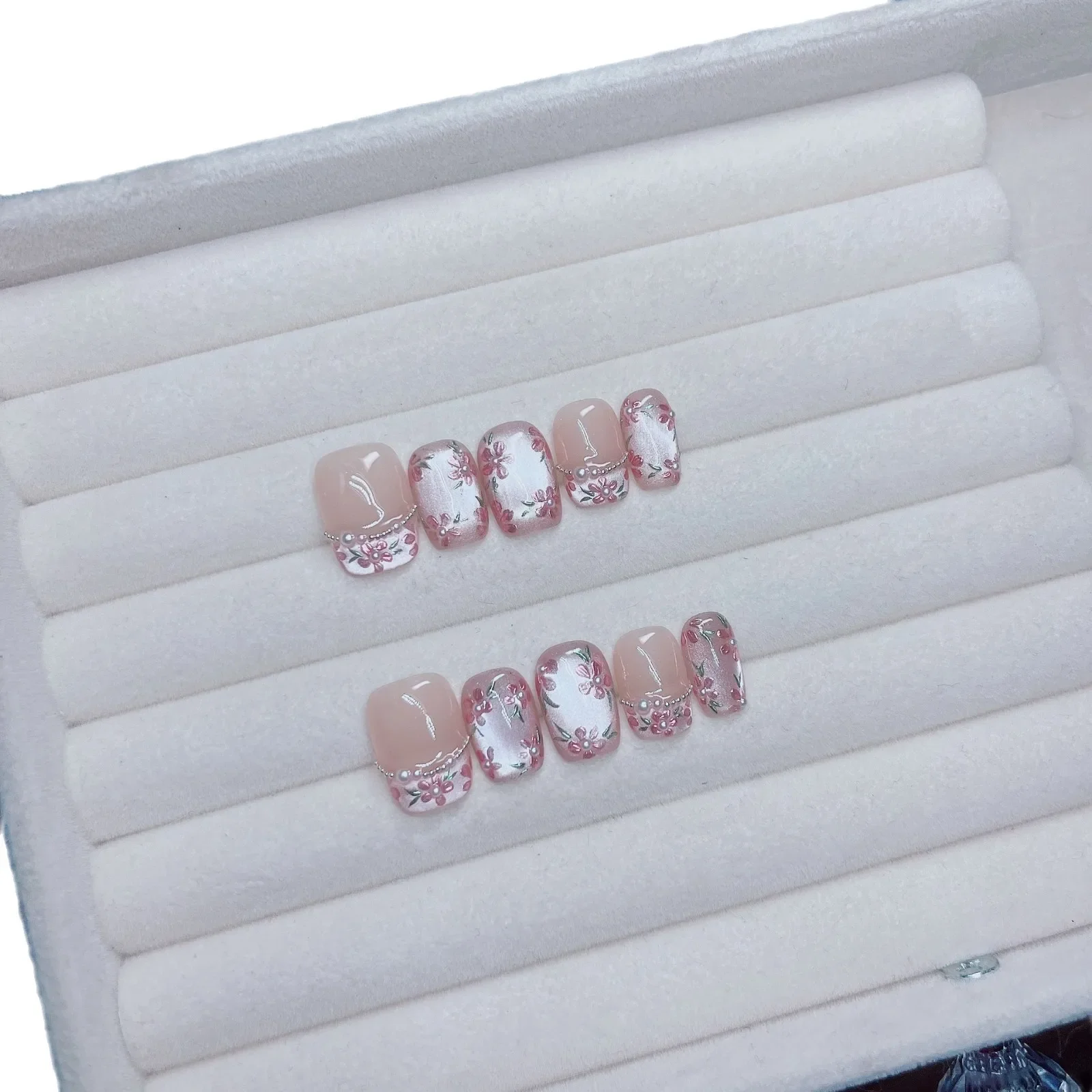10Pcs/Set Press On Acyrlic Ice Cat’s Eye Handmade Fake Nails Short/Medium Almond 3D Mirror Flower Pearls Decor Nude French Nails