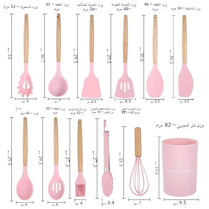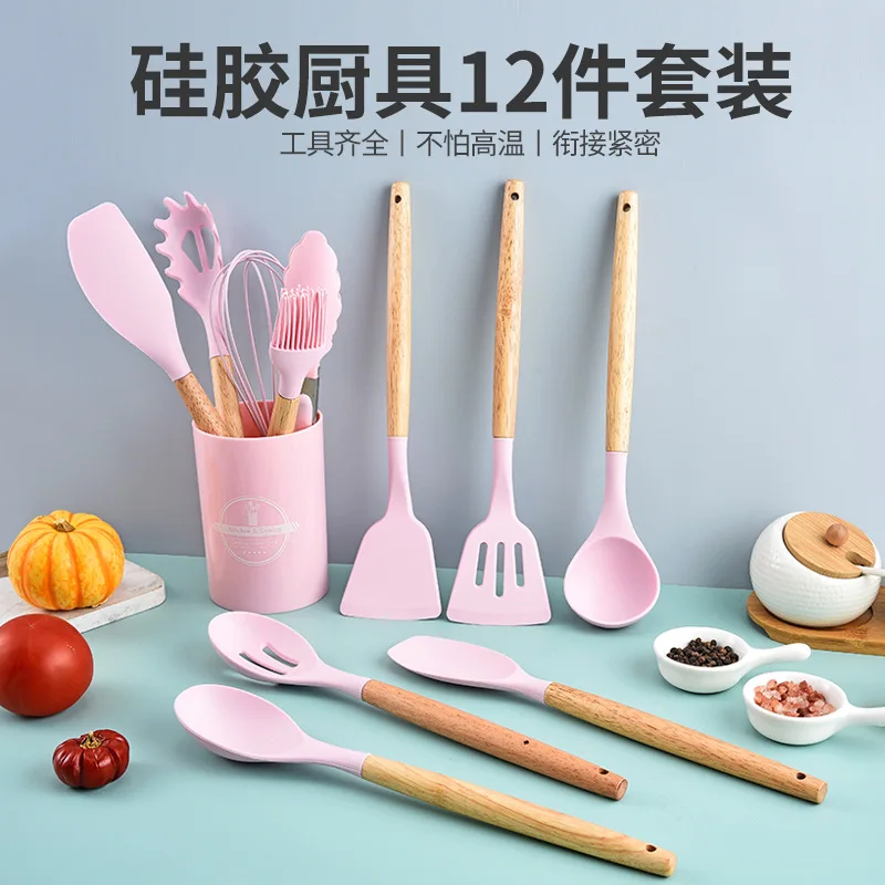 12PCS Silicone Kitchenware Non-Stick Cookware Kitchen Utensils Set Spatula Shovel Egg Beaters Wooden Handle Cooking Tool Set