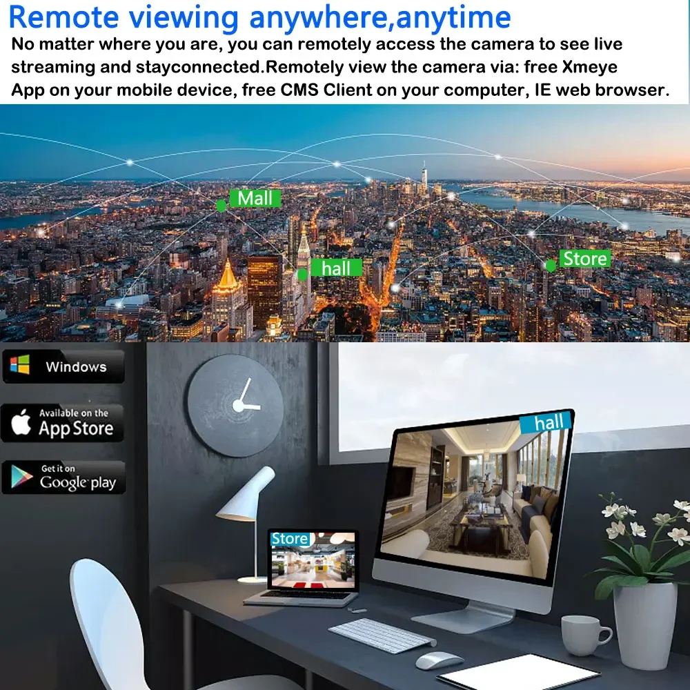 Support ios, Android,Windows PC. With the free app XMEYE PRO. you’ll know that’s happening even when you’re not around, Receive notifications and view live or recorded footage right from your phone.