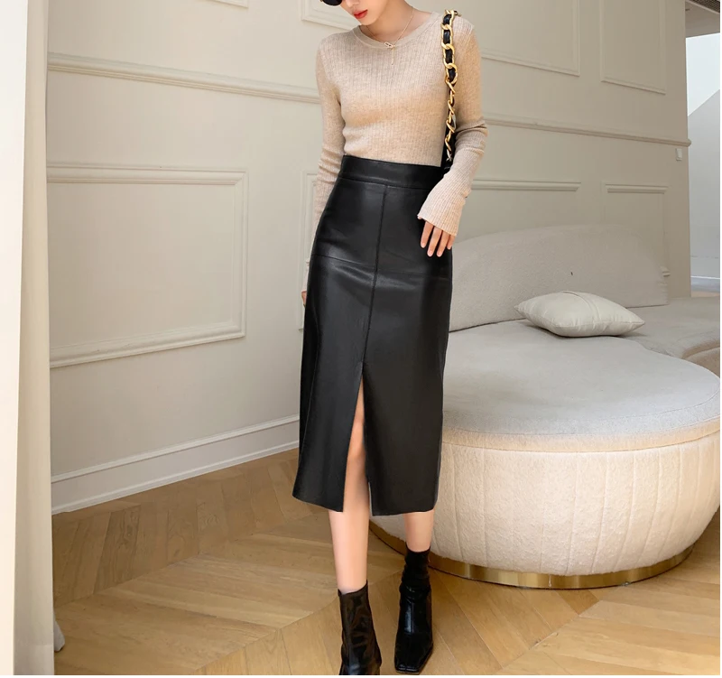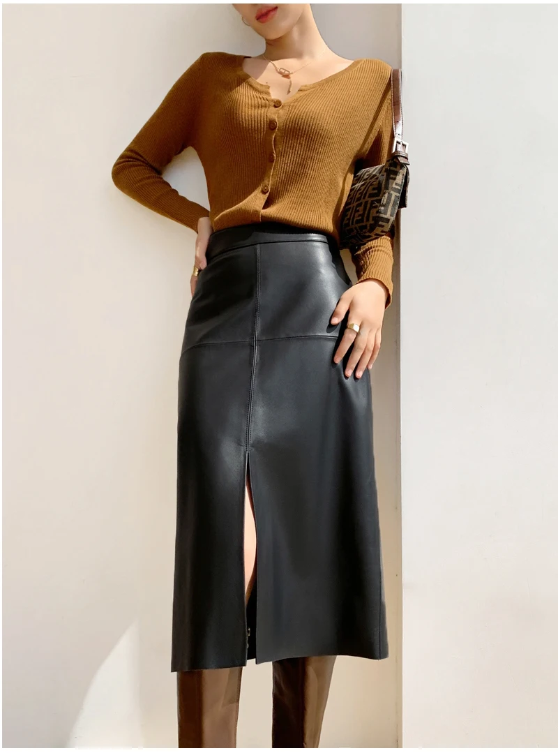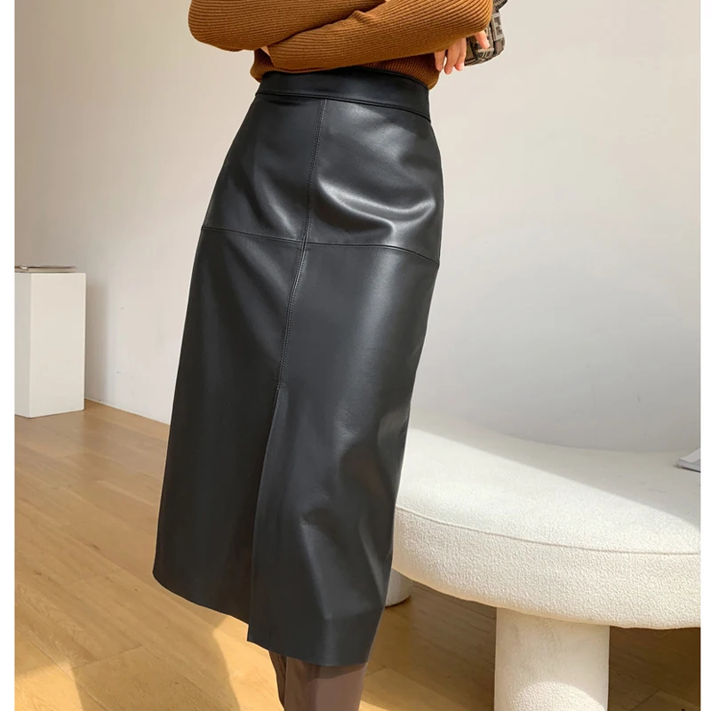 2025 New Genuine Leather Skirt for Women Vegetable Tanned Sheepskin Wrap Long Faldas Mujer Mid Length Front Slit Mid-Calf