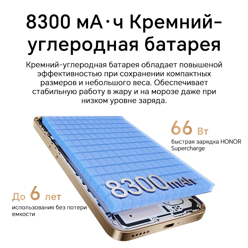 3. Battery and charging: 8300mAh(typical value), Type: Li-ion Polymer Battery; Wired charging: Supported 66W; Standard charger: The phone supports up to 20V/3.3A super-fast charging