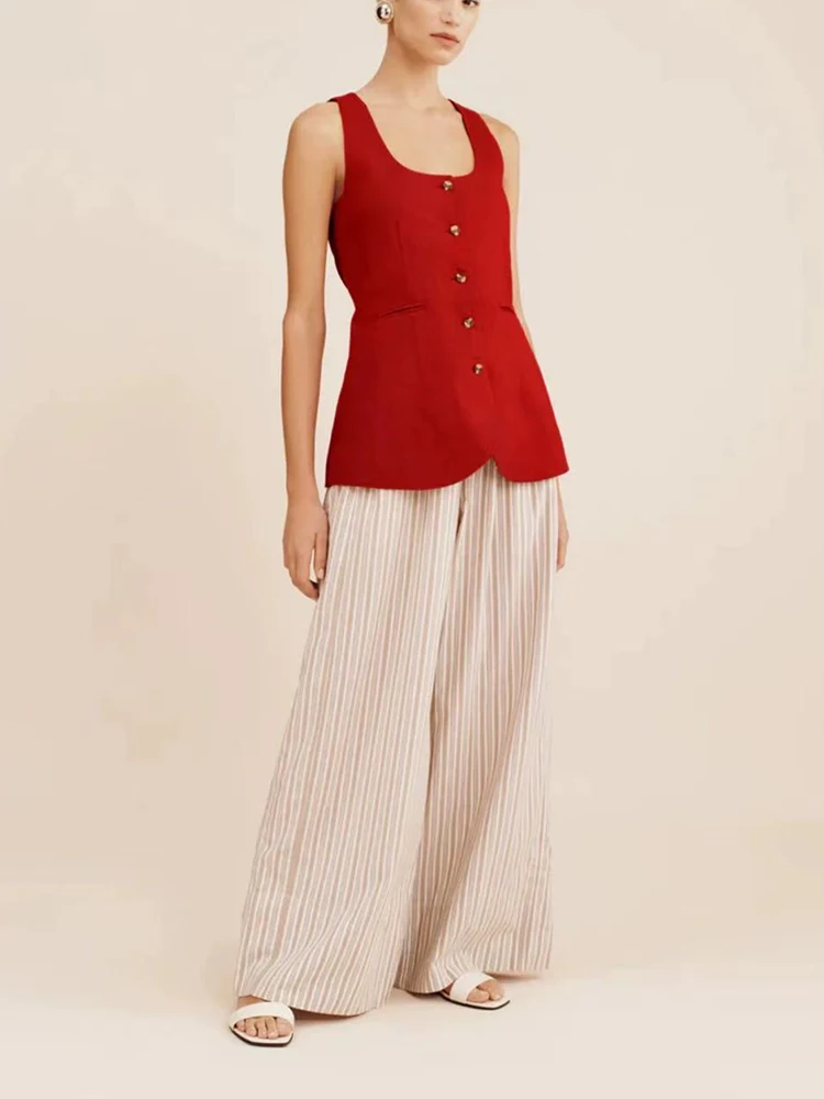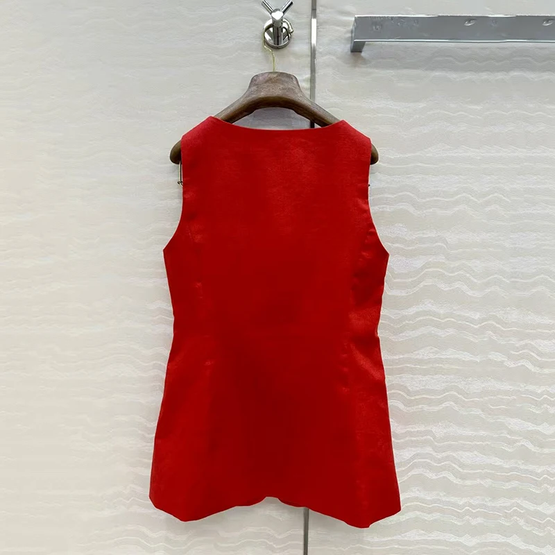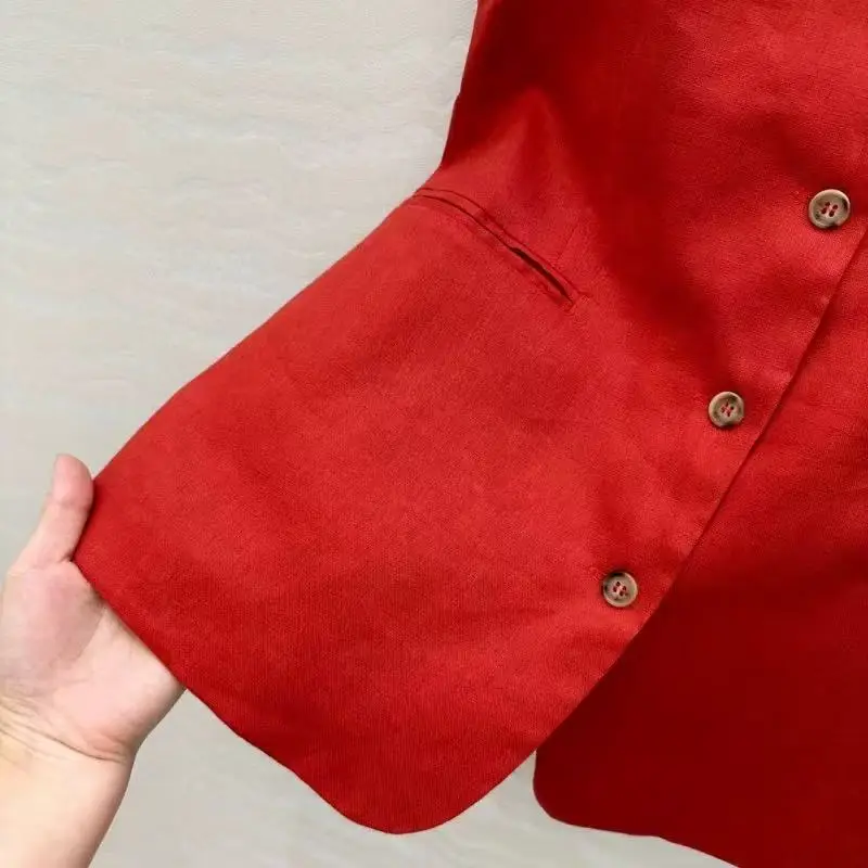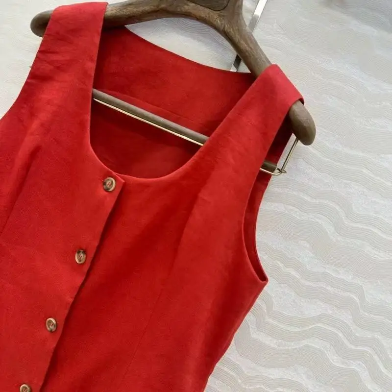 2025 new linen U-neck, cinched waist, high waist, slimming, single-breasted, slimming, medium-length waistcoat for women