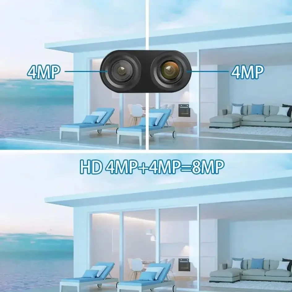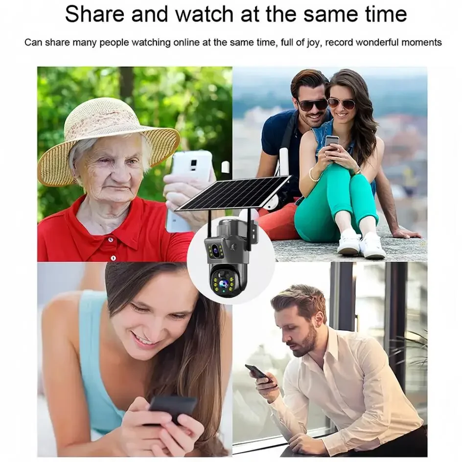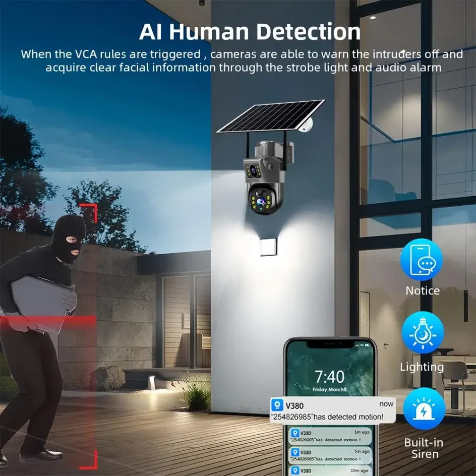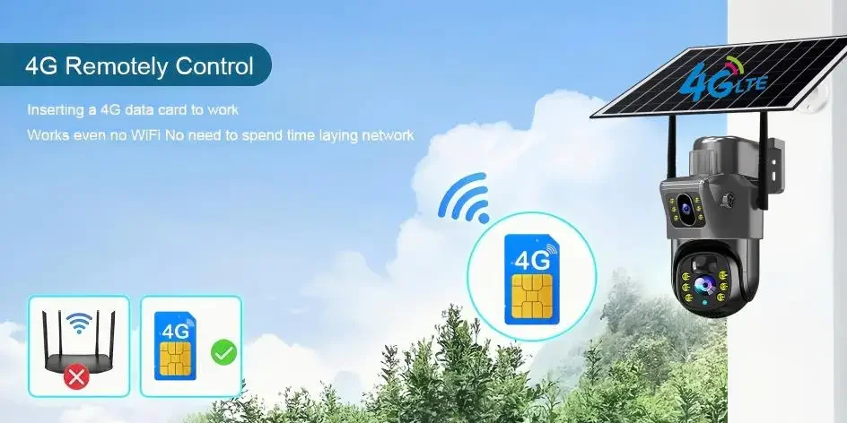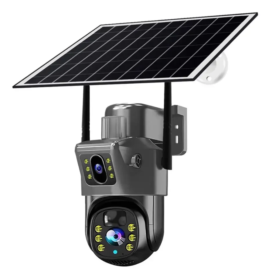 Solar security camera doesn't need cables, no power supply. Simply insert the 4G version SIM card or connect to WiFi 2.4G version wifi to use it with built-in battery and continuous solar charging for 365 days uninterrupted use. Easy to install and use. Save unnecessary and tedious steps, save time and labor4K 8MP HD quality 2-screen surveillanceDual lens surveillance with no blind spots. Built-in rotary motor, fixed point cruise wherever you want to see. When shooting, you can set the shooting positionTwo-way voice-to-voice real-time communication, no distance. Support two-way real-time voice calls, easy intercomAutomatic tracking and AI body detection alarms