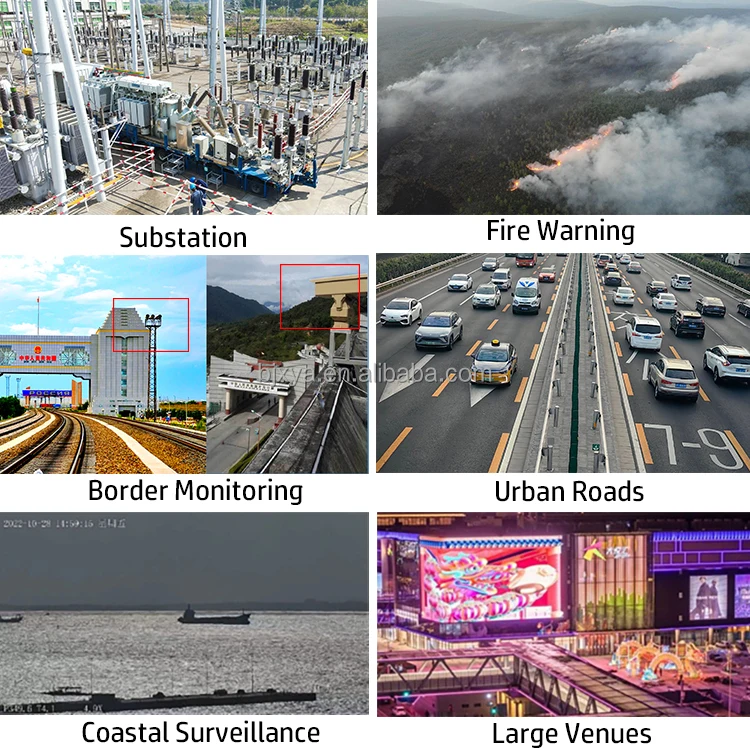 border/military/road/square/factory monitoring, parking lots, and perimeter protection. Specialized uses cover railway lines,large venues, coastal/shipborne/airport coastal defense, petrochemical/natural gas sites, ports, vehicle-mounted systems, andshipboard monitoring.