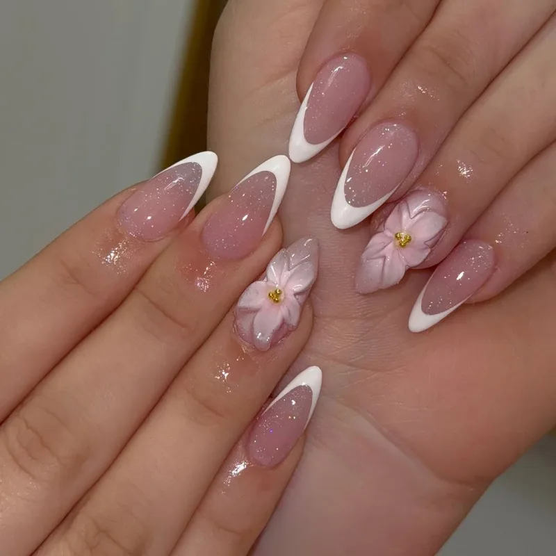 24PCS Pink Almond Press on Nails Full Cover Carved Flower 3D Ripples French Fake Nails for Women with Golden Pearl Wearable Nail