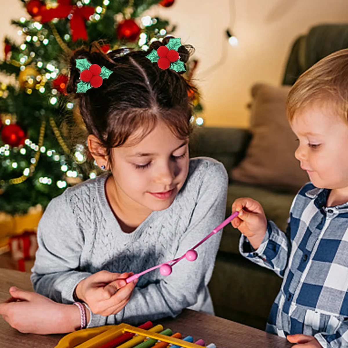 2 matching holly hairpins, perfect for double ponytails or sharing with a friend.