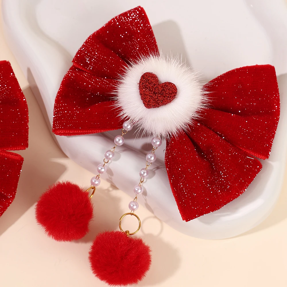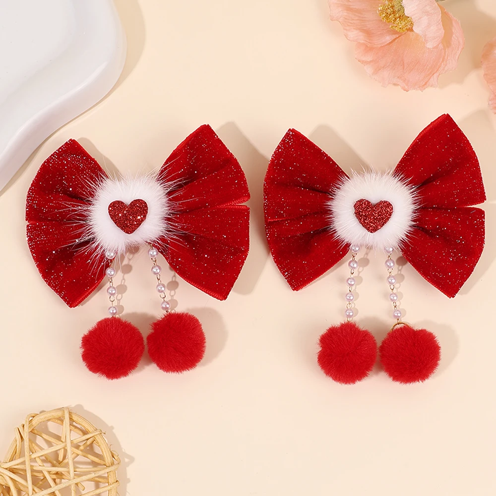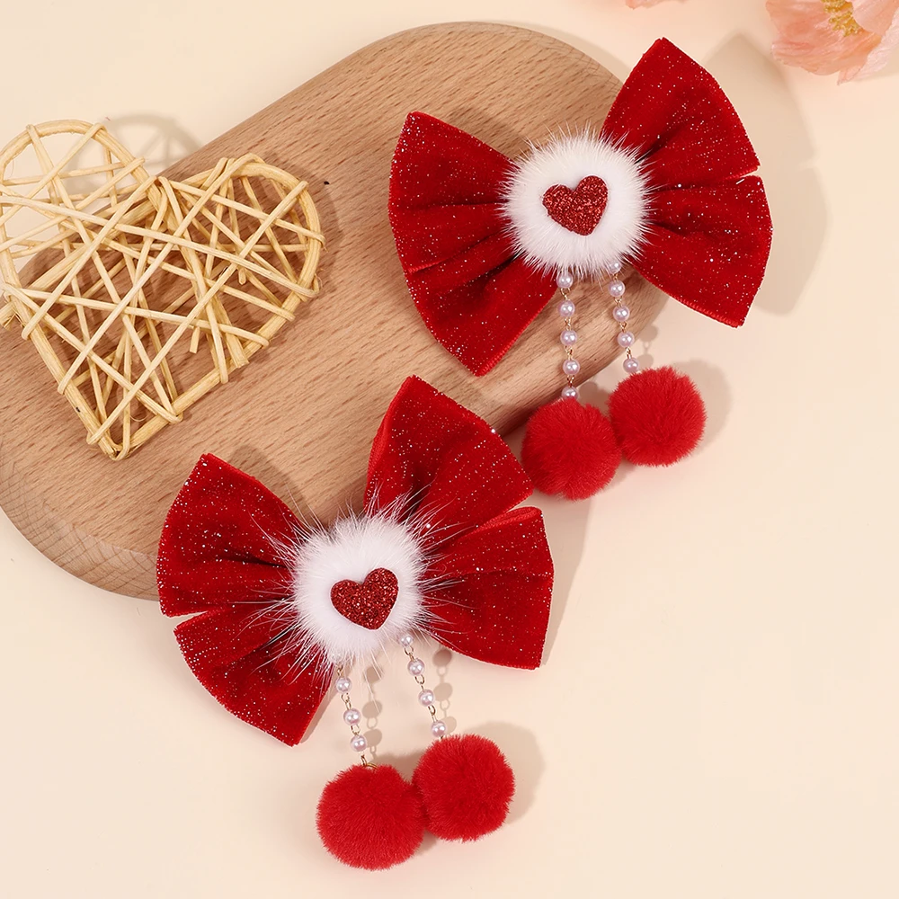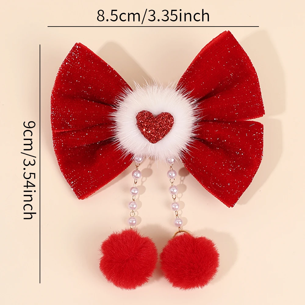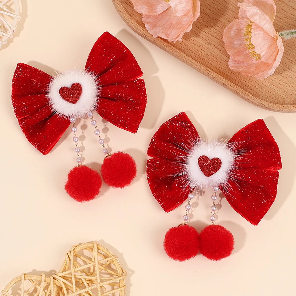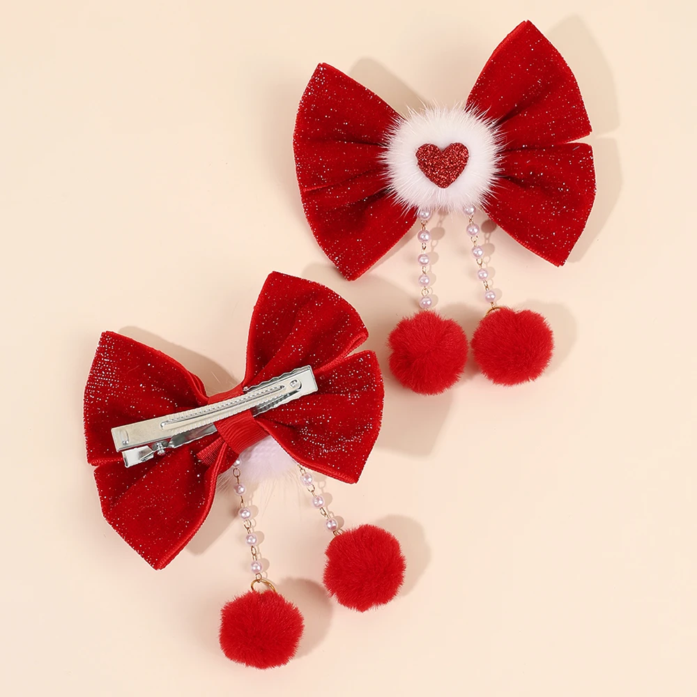 2Pcs Glitter Velvet Bow Hair Clips With Fuzzy Ball Tassels Elegant Cute Red Heart-Shaped Bow Barrette Hair Accessories For Girls