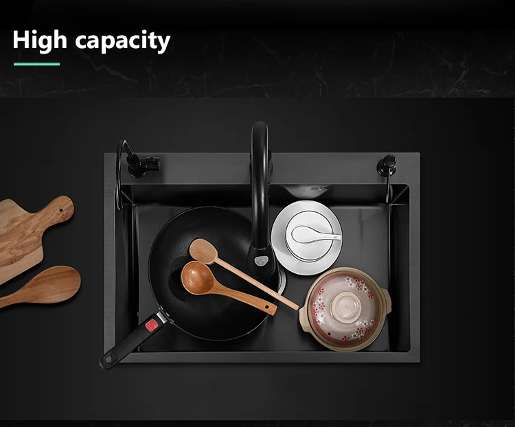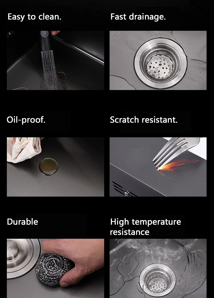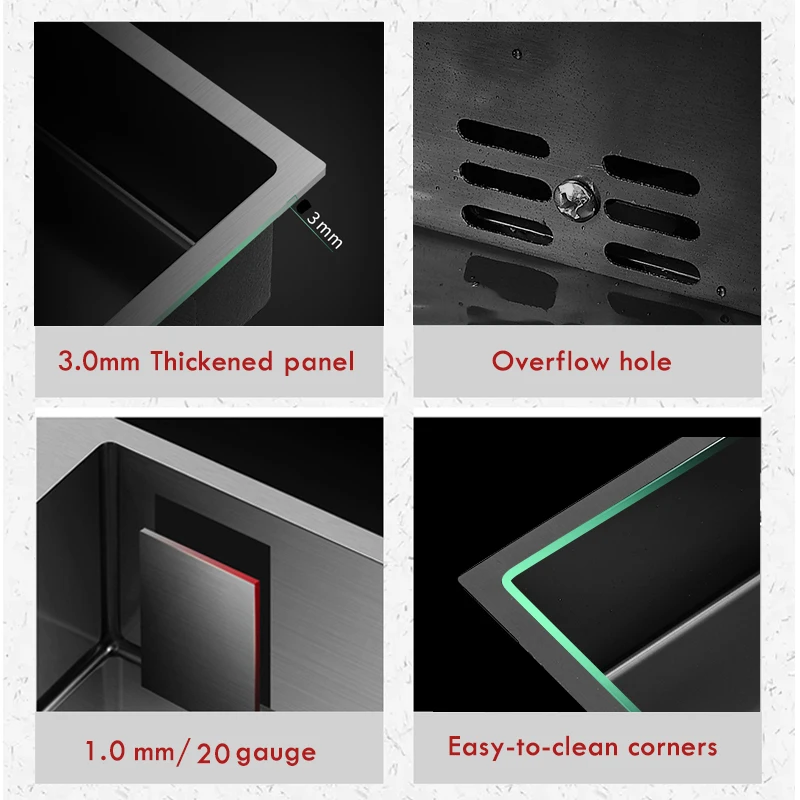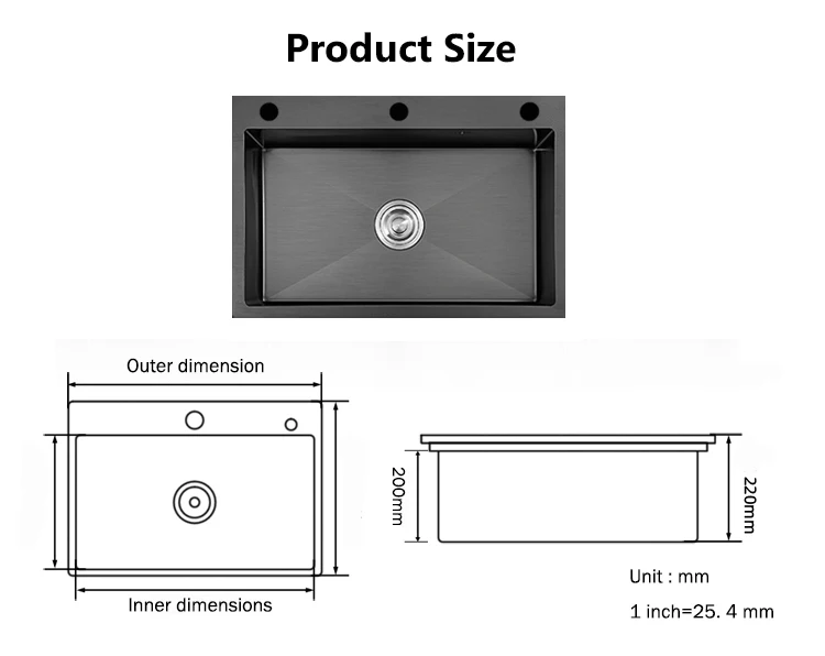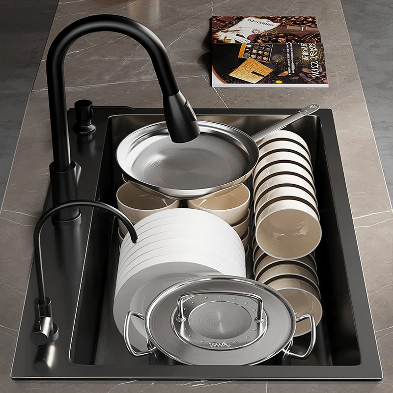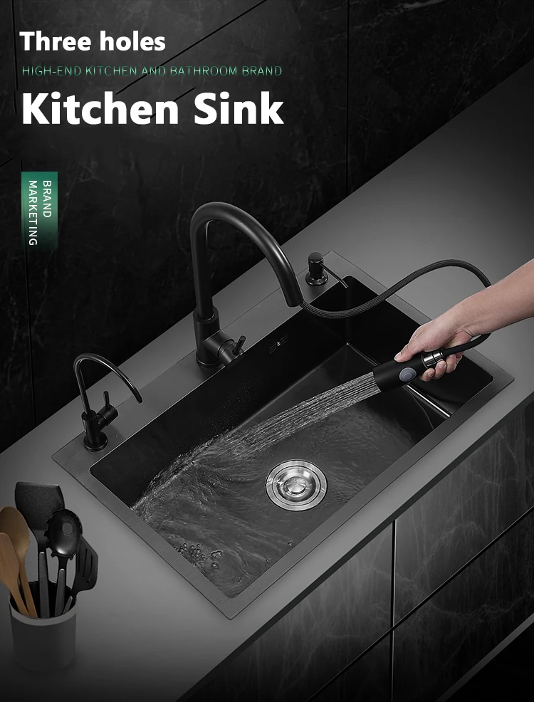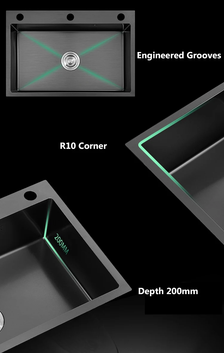 3 Holes 304 Stainless Steel Topmount Kitchen Sink Single Bowl Dark Black-Gray Wash Basin For Home Fixture Drain Accessories