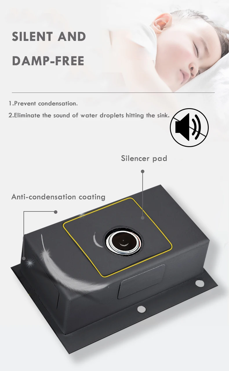 Extra-thick rubbersound dampening pads cover 80% of sink base to absorb noise and vibration.