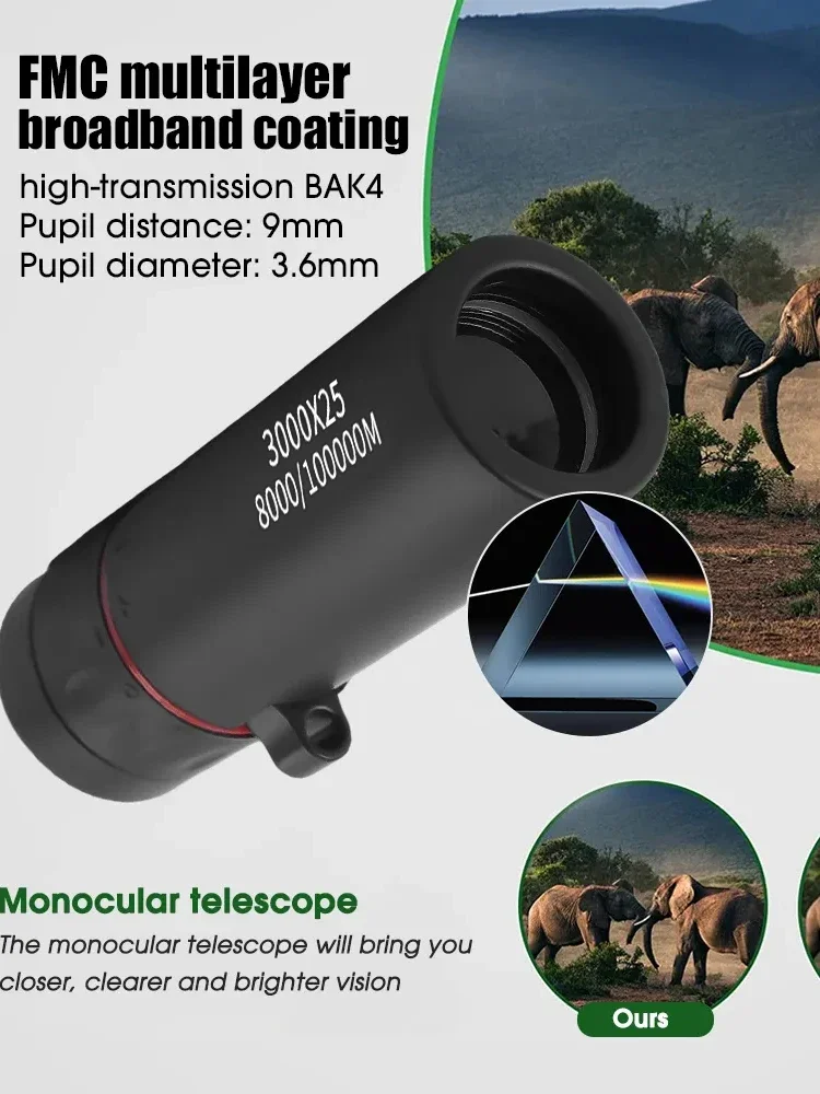 3000×25 Long Range HD Professional Adult Monocular and Mini Portable Telescope for outdoor camping and hunting