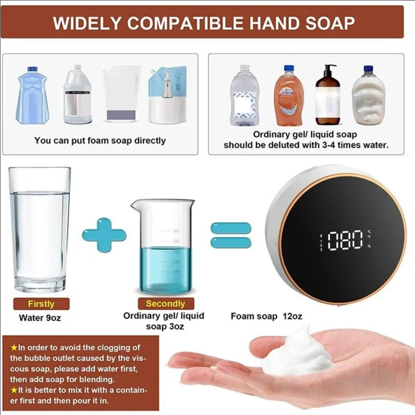 2. Each soap dispenser is fully inspected before shipment, including foaming condition after the liquid is added. Therefore, it is normal for a small amount of moisture or foaming after receiving the product.