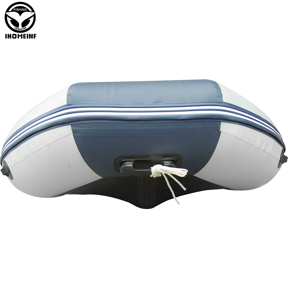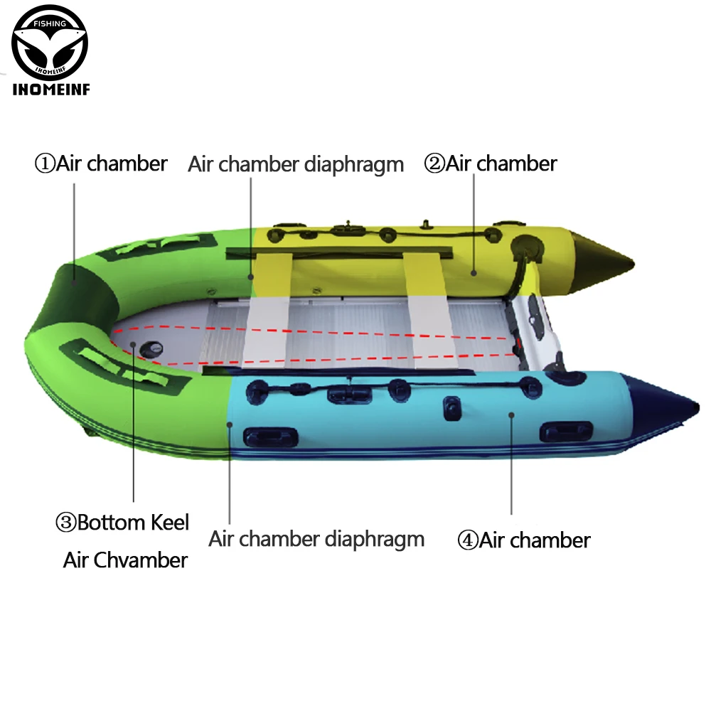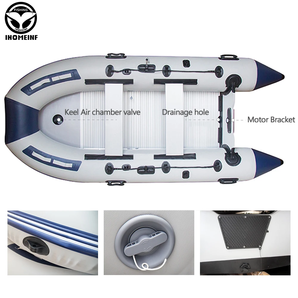●Deep V-keel with rub-strake protection for easy planing . four individual chambers, one-way drain valve with plug, built-in oarlock for easy rowing, aluminum side joiners with rubber ends, Stainless steel D-rings for easy towing.