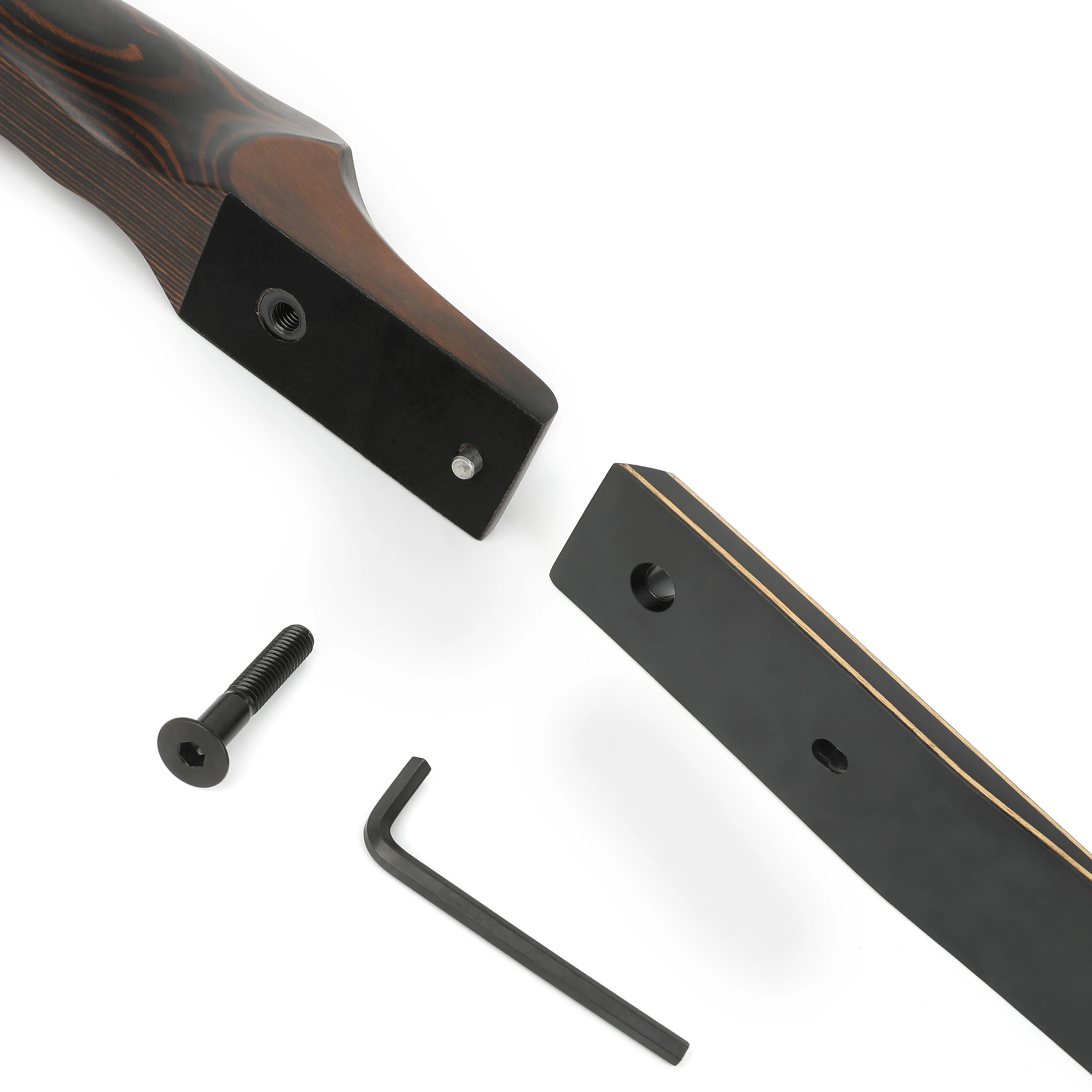 Package: 1x bow handle, 2x bow limbs, 1x bow string, 1x fur arrow rest, 2x screw, 1x wrench