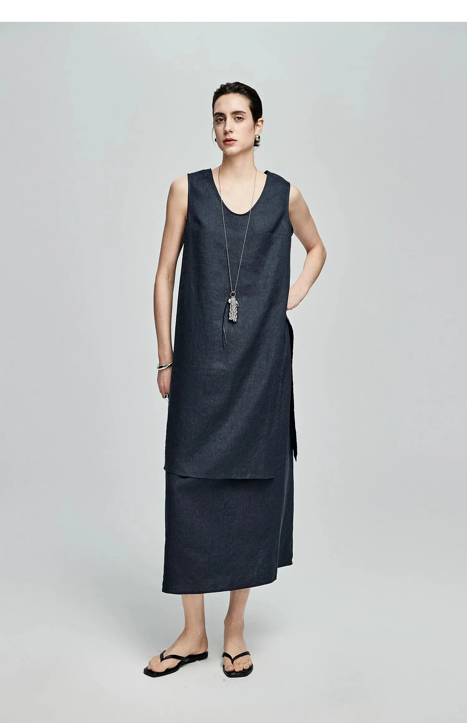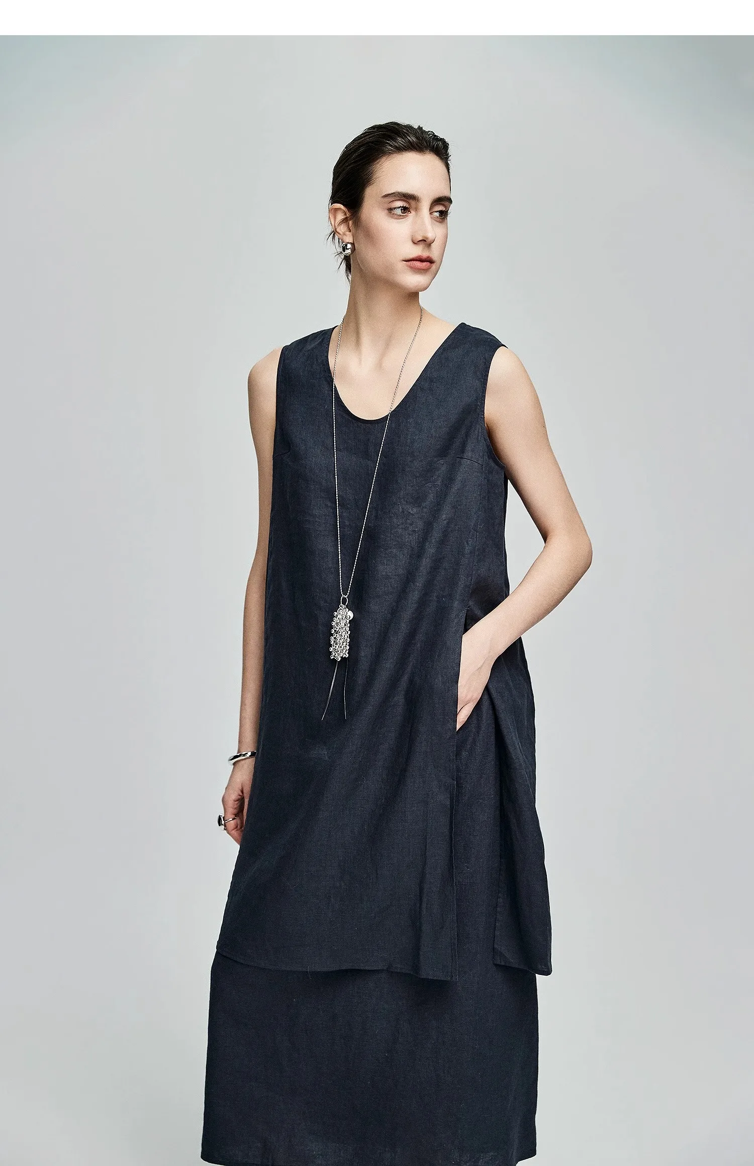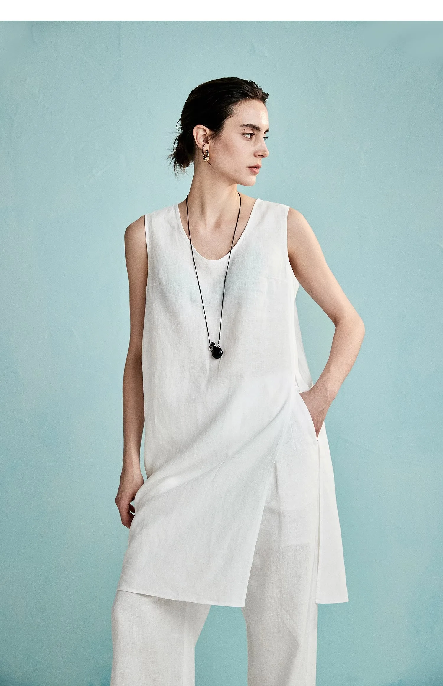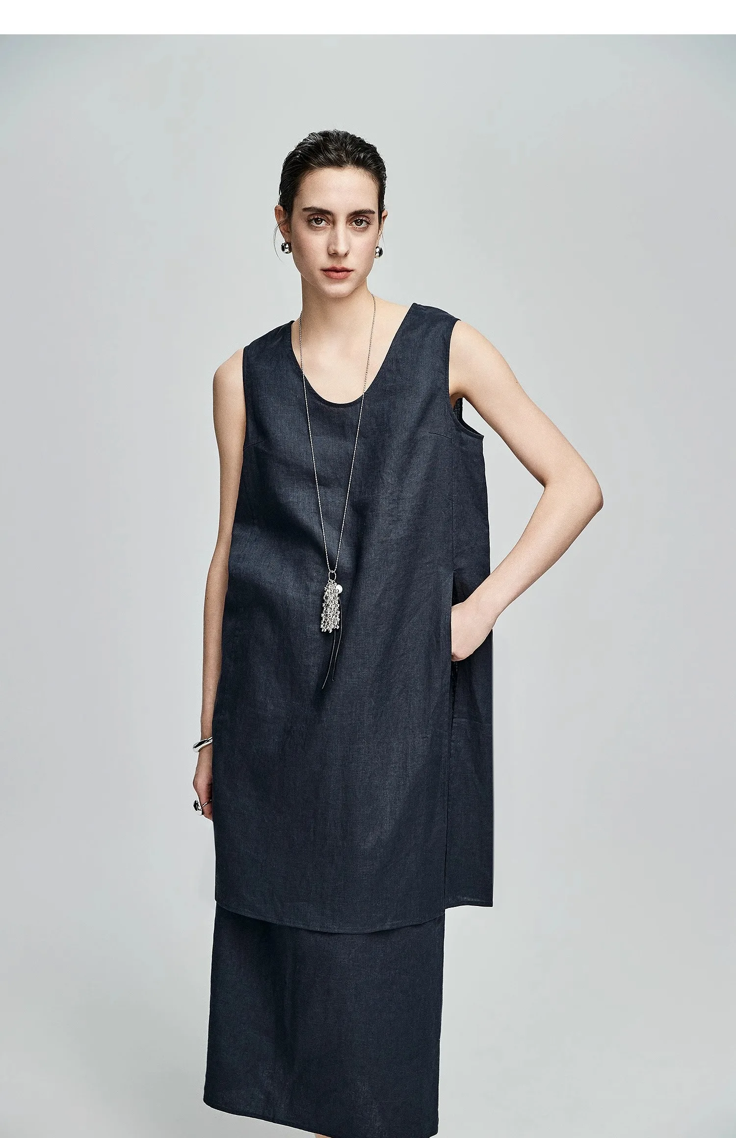 All-linen U-neck side-slit smock female Spring/Summer 2025 Sleeveless top