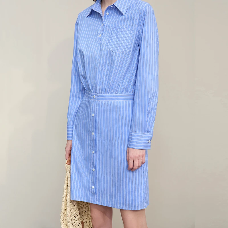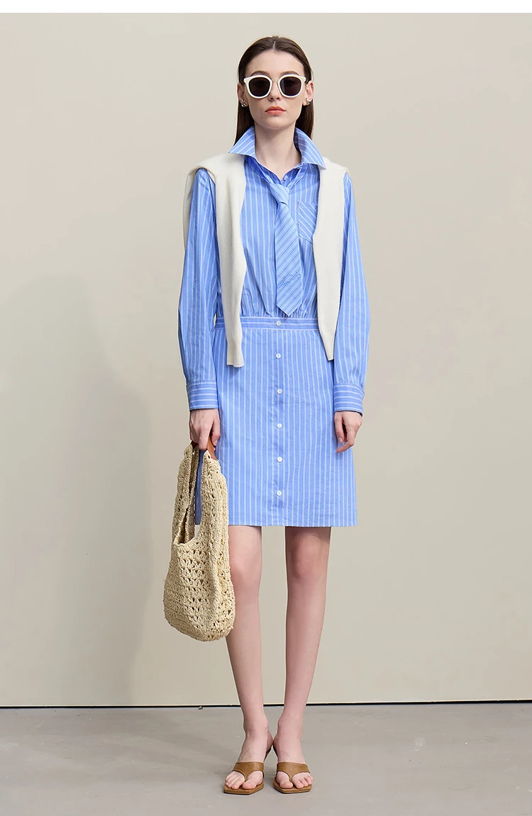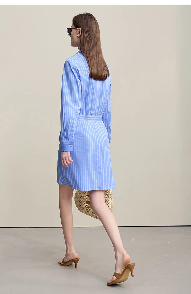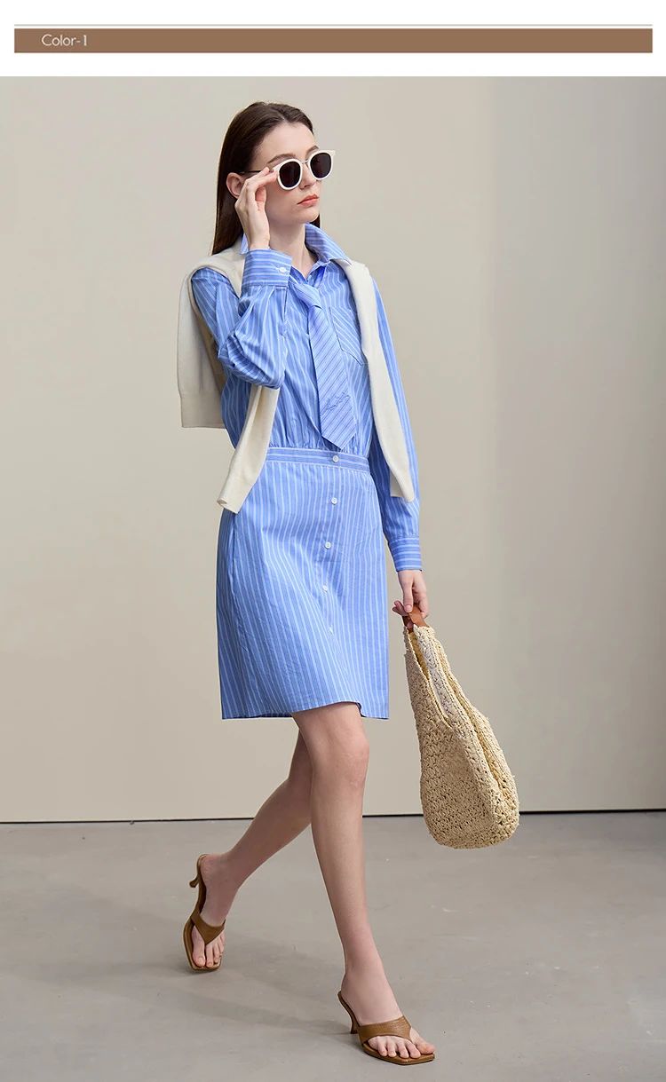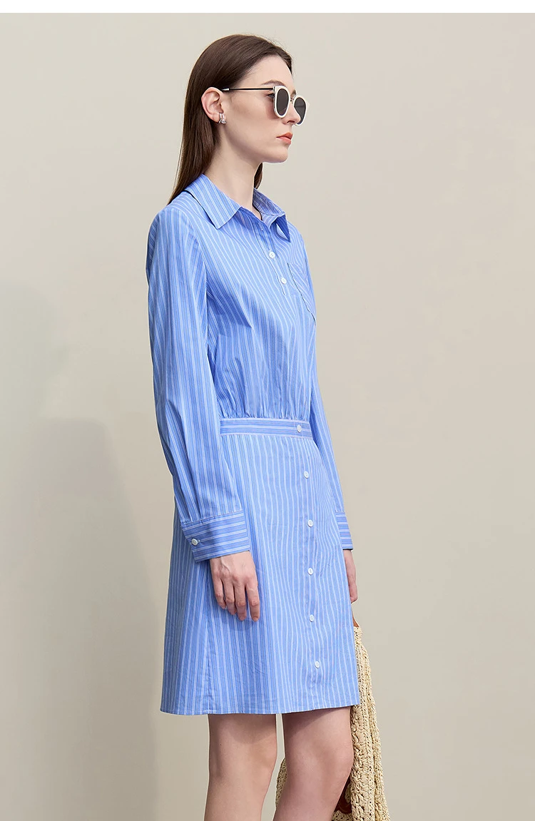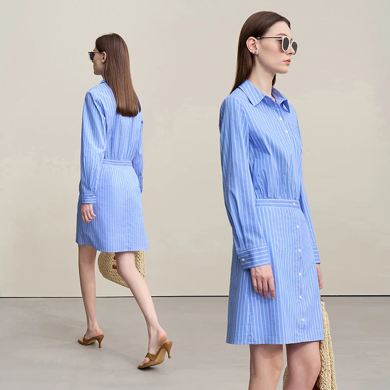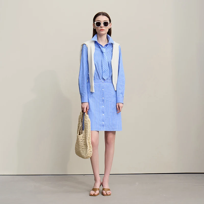 Amii Dresses For Woman 2026 Spring New Commuter Lapel Striped Half-open H-Line Dress Casual Long Sleeve Blouse Skirt 12641048