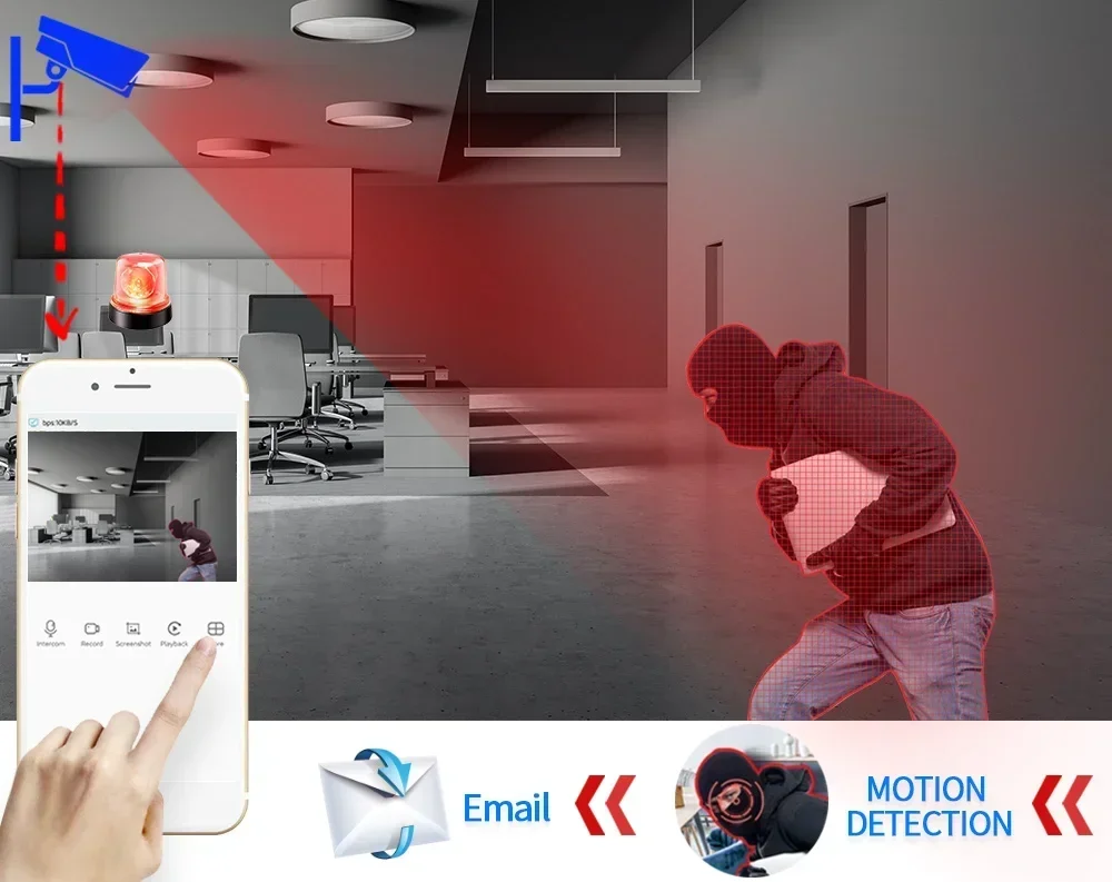 Can set up the area you want to control,When it is triggered,it will send message to your email ,You can get the first hand information ,no matter when and where you are .
