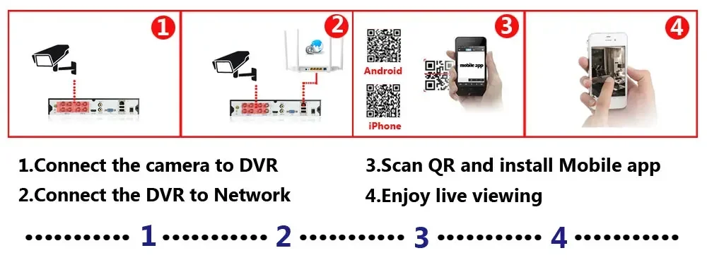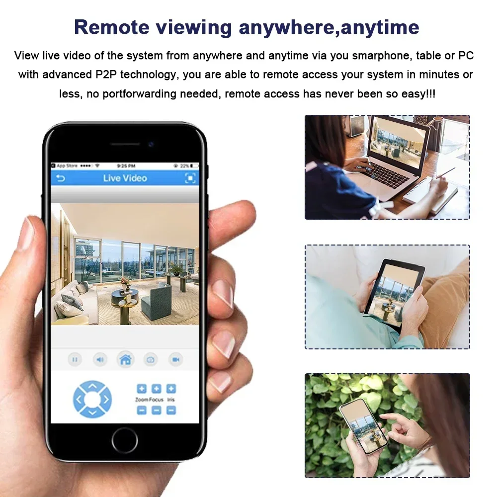 Easy setting , just 4 steps for mobile phone viewing,View live video of the system from anywhere and anytime via you smarphone, table or PC with advanced P2P technology, you are able to remote access your system in minutes or less, no portforwarding needed, remote access has never been so easy!!!