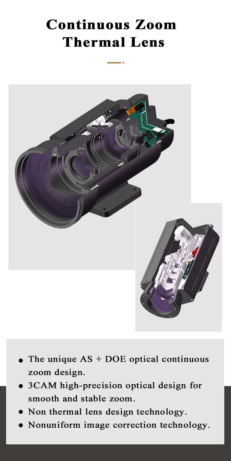 3. Optical machine: 3CAM mode and AS+DOE optical structure, high infrared over transmission, zoom process without virtual focus, smaller axis. |