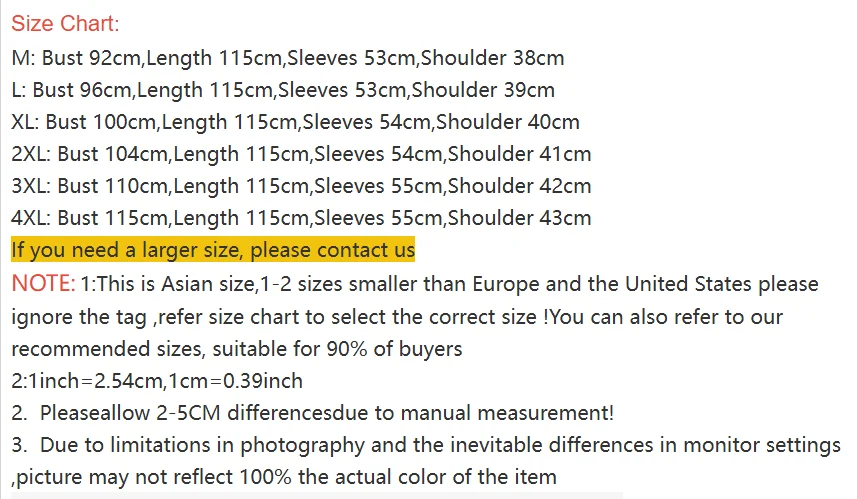 3XL: Bust 110cm,Length 115cm,Sleeves 55cm,Shoulder 42cm