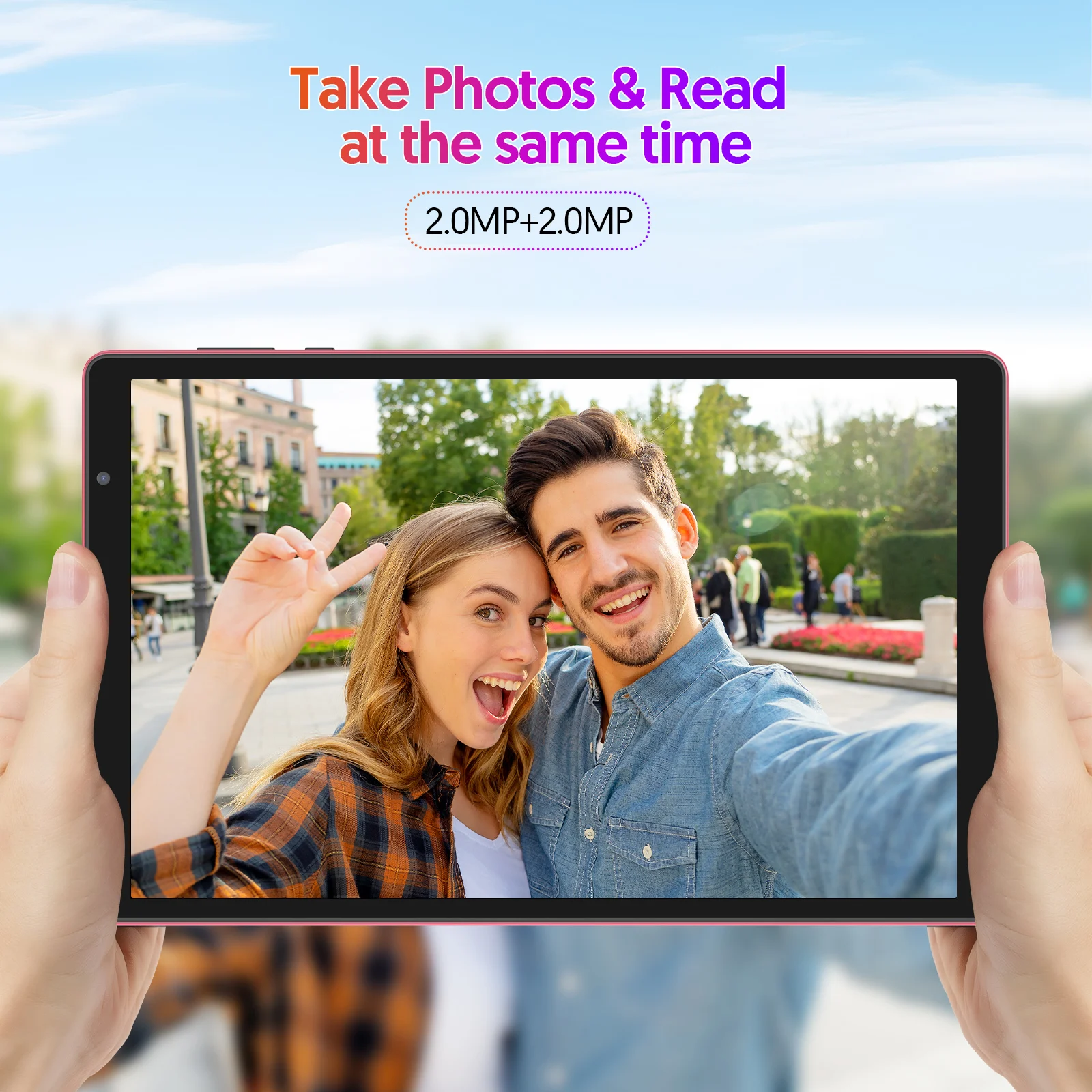 Capture life's moments with clarity using the tablet's dual cameras, featuring a 2MP front and an 8MP rear lens.