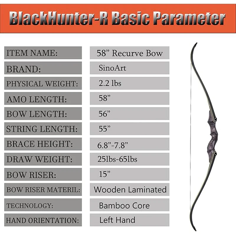 Black Hunter Takedown Recurve Bow F178 58inch with Bamboo Core Limbs Archery Hunting Target Practice for Hunting Target25–65lbs