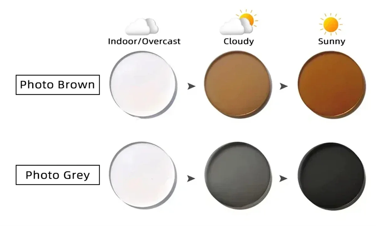 The lens has anti blue light function and will darken in sunlight, turning brown/gray (changing color with changes in UV intensity)
