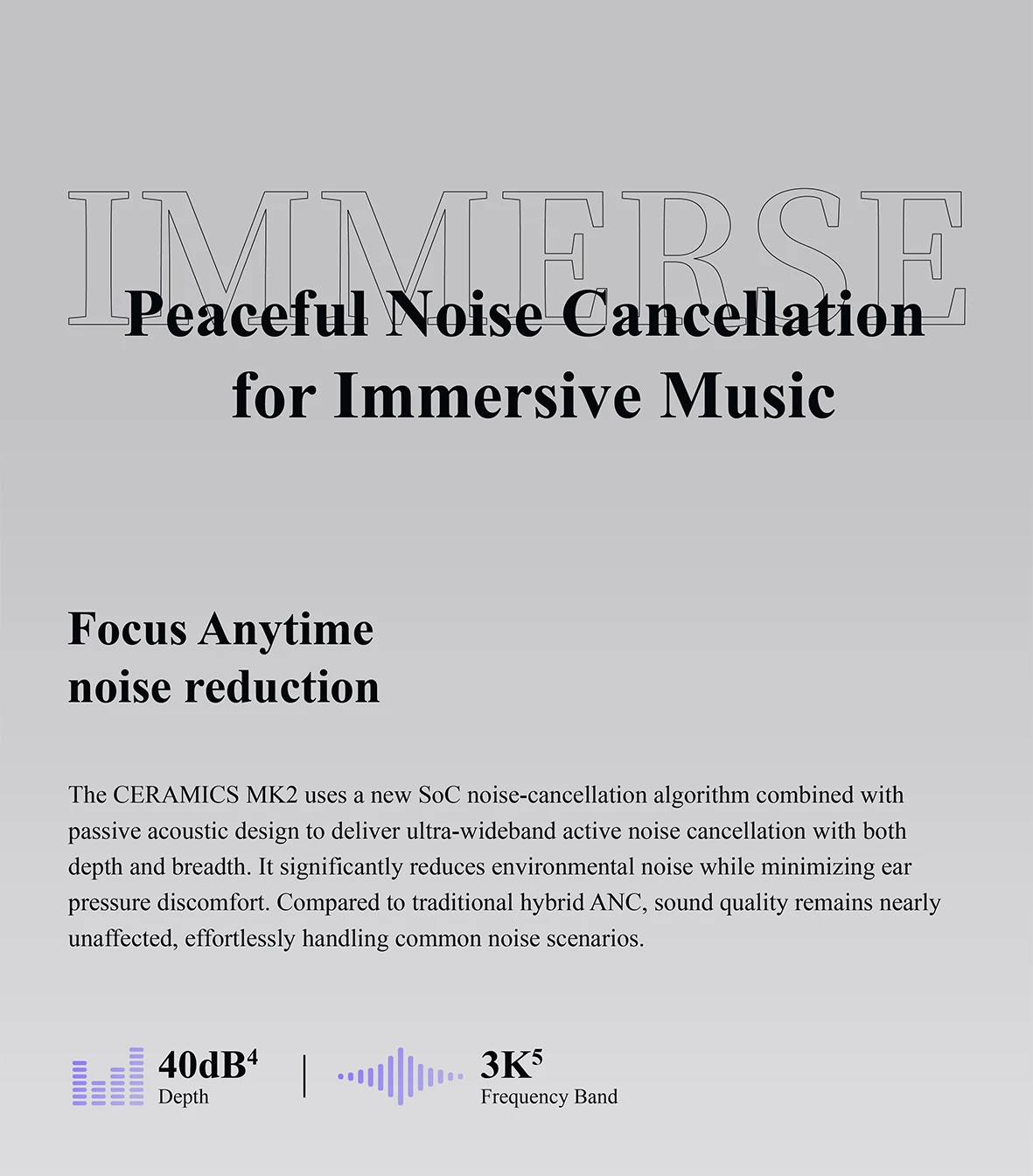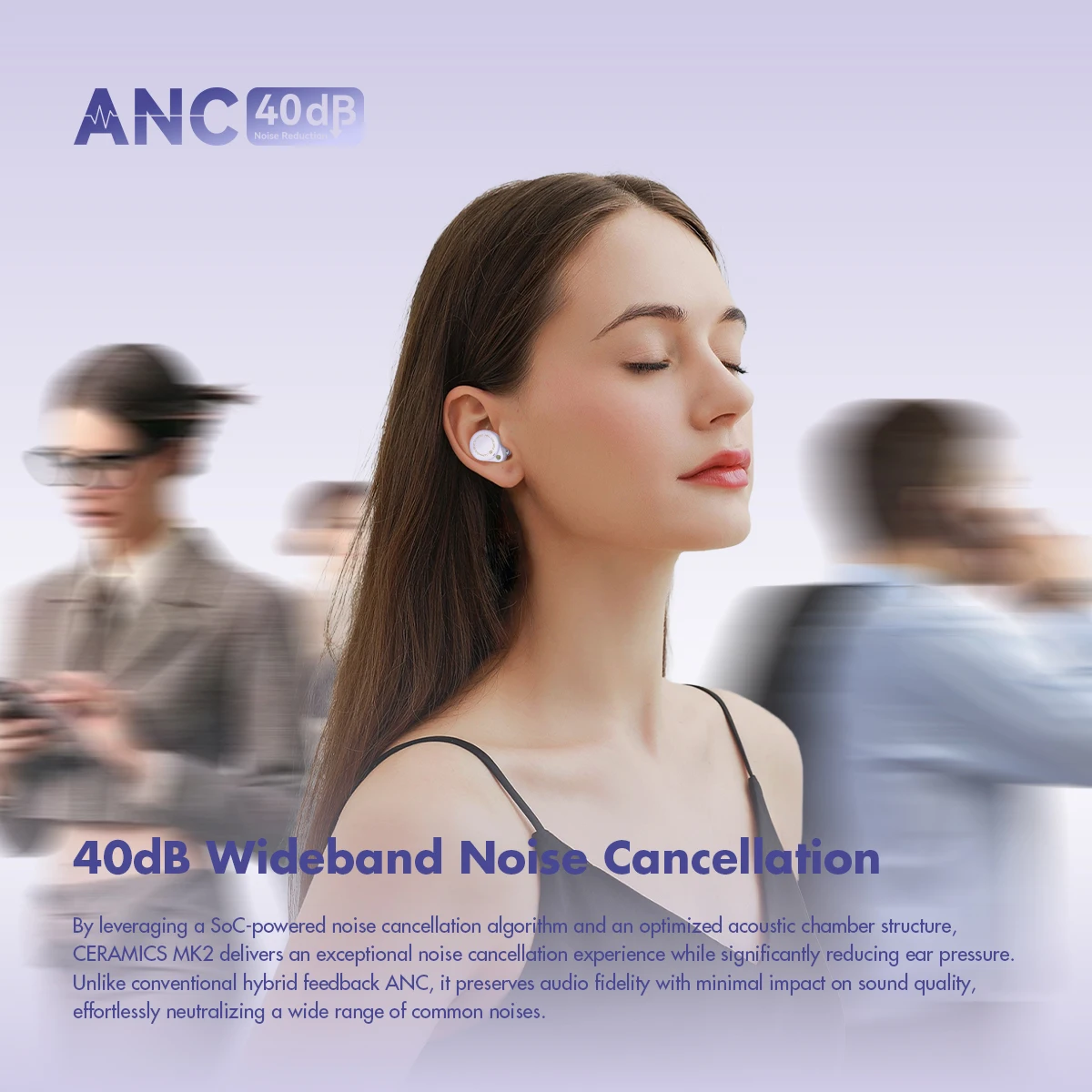 40dB Wideband Noise Cancellation – By leveraging a SoC-powered noise cancellation algorithm and an optimized acoustic chamber structure, CERAMICS MK2 delivers an exceptional noise cancellation experience while significantly reducing ear pressure. Unlike conventional hybrid feedback ANC, it preserves audio fidelity with minimal impact on sound quality, effortlessly neutralizing a wide range of common noises.
