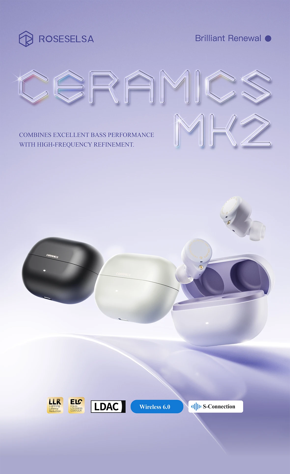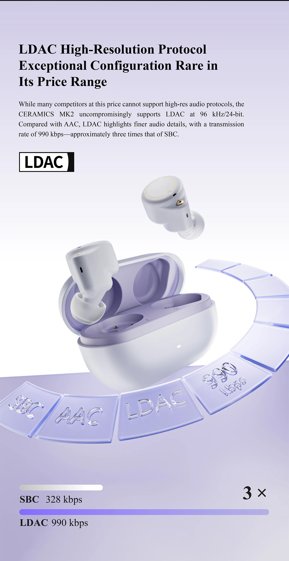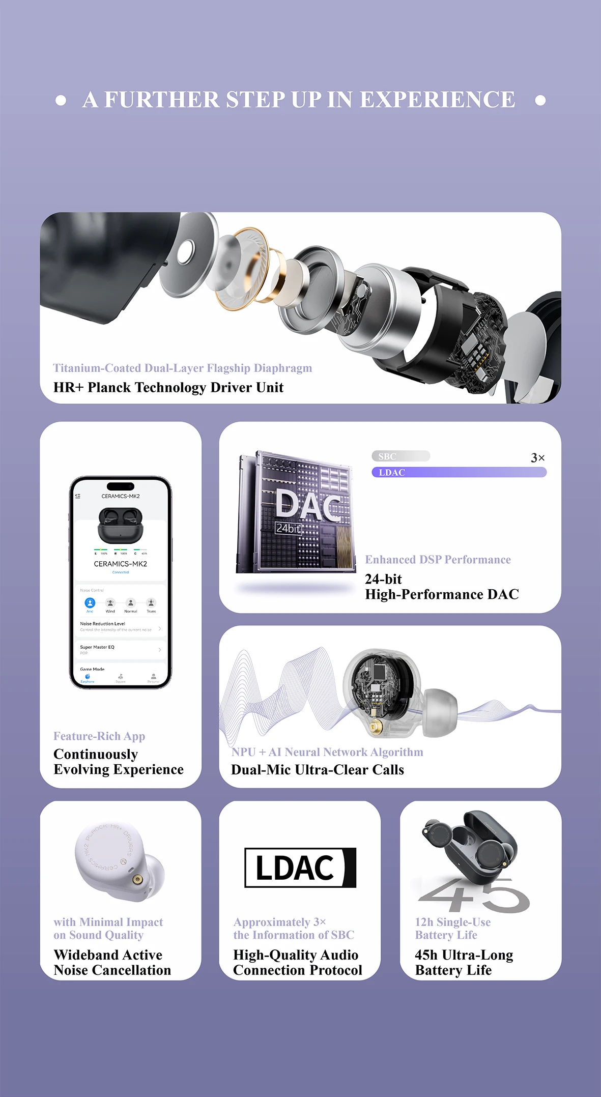 High Resolution LDAC Codec – While most competitors at this price range forgo high-res audio support to cut costs, CERAMICS MK2 sets itself apart by featuring LDAC codec. This commitment to fidelity means tripling the data transmission of the standard SBC codec, delivering truly lossless sound quality.