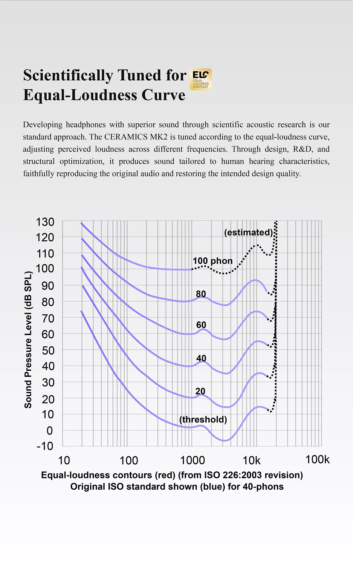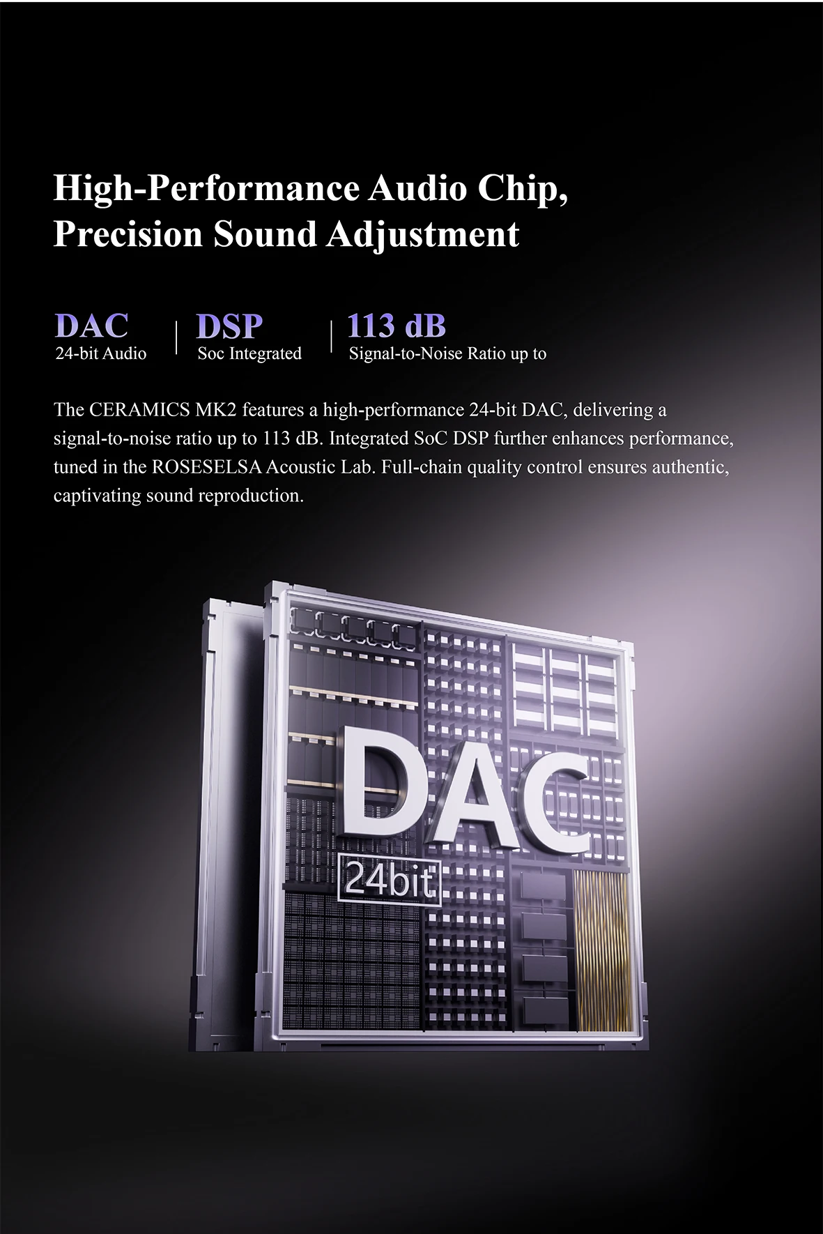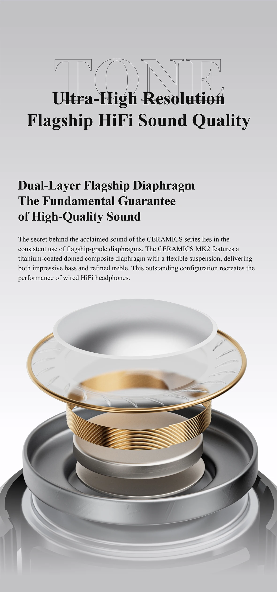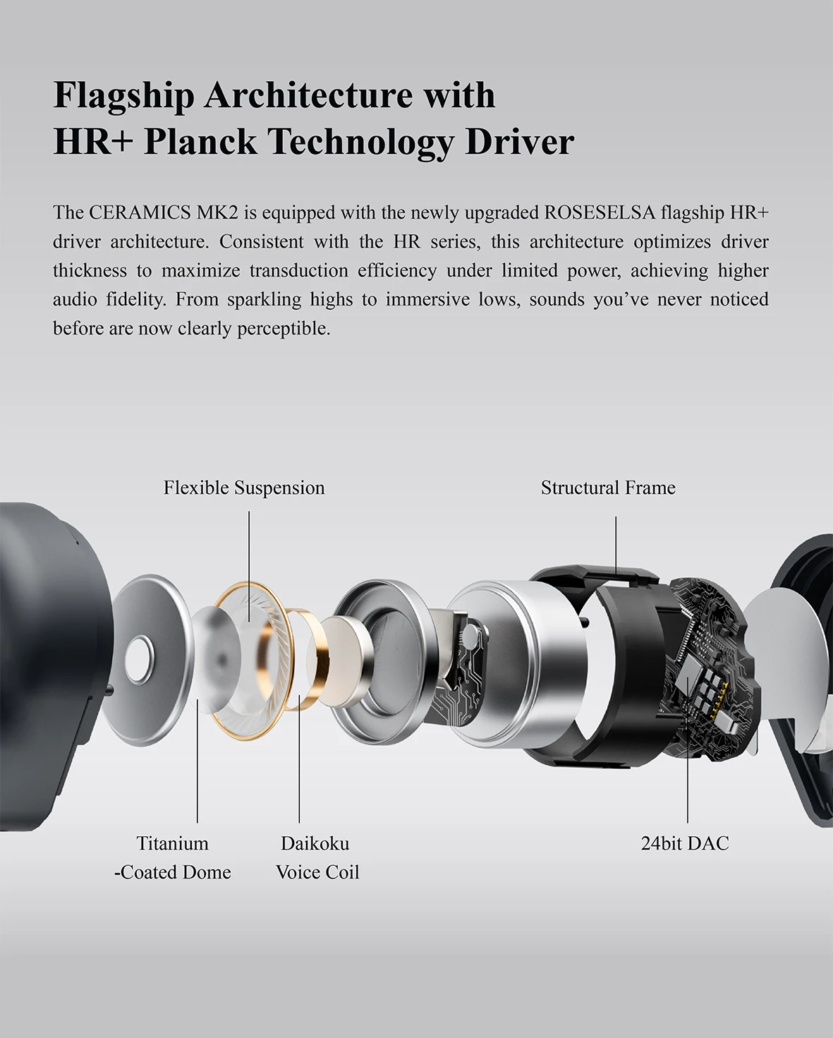 Inheriting Excellent Sound of CERAMICS Series – Housing the upgraded HR+ Planck structure, CERAMICS MK2 is equipped with a titanium-coated dome composite diaphragm with a flexible surround, and a premium 24-bit DAC chip. SNR 113dB. The DSP integrated in SoC further enhances transduction efficiency, which delivers brilliant treble and profound, resonant bass. The audio output is meticulously fine-tuned based on the equal-loudness contour, ensuring the sound signature matches the human ear's sensitivity to different frequencies.