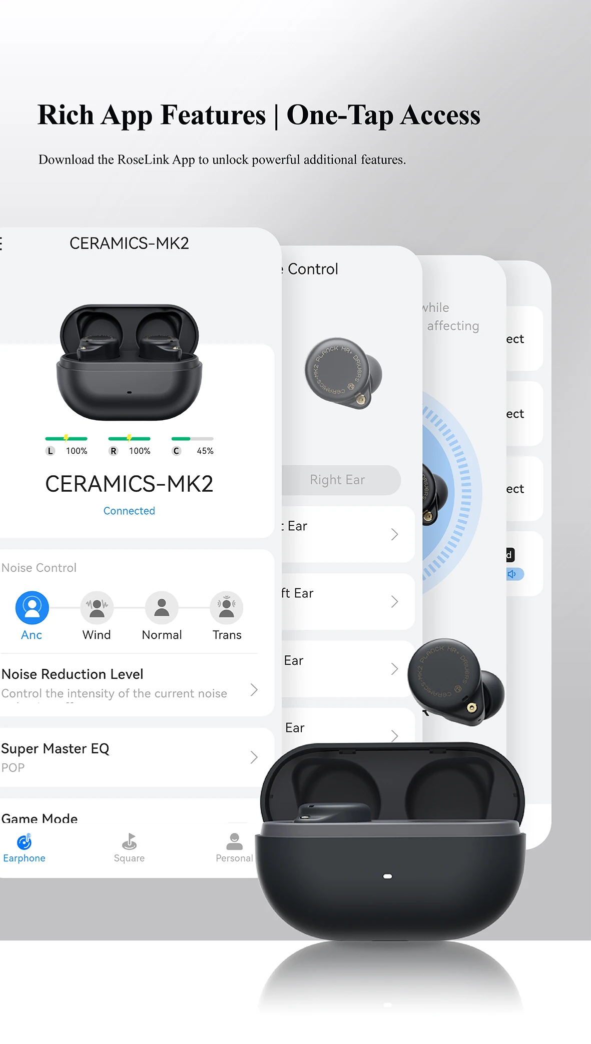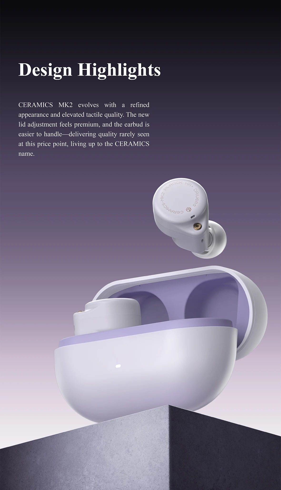 Ad-Free APP & Golden Spark Design – Control your earbuds effortlessly with our concise, ad-free, and self-developed APP. No login required. In the CERAMICS series, MK2 undergoes a refined evolution, boasting a significant leap in build quality and design, solidifying its position as the ultimate value king.