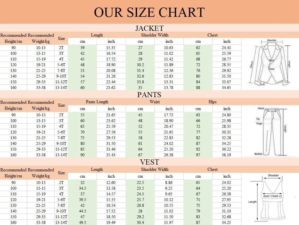 ⚪Fit Rules All: Please refer to our image size chart for the best size and fit. Our boys' first class slim suits may run a tad smaller due to it's tailored fit. Evey Suit Includes: A Slim Fit Blazer, Matching Fully Lined Vest and Matching Trousers. From the wedding halls to the streets. An ideal fit for every occasion. Shirt and Tie are NOT included.
