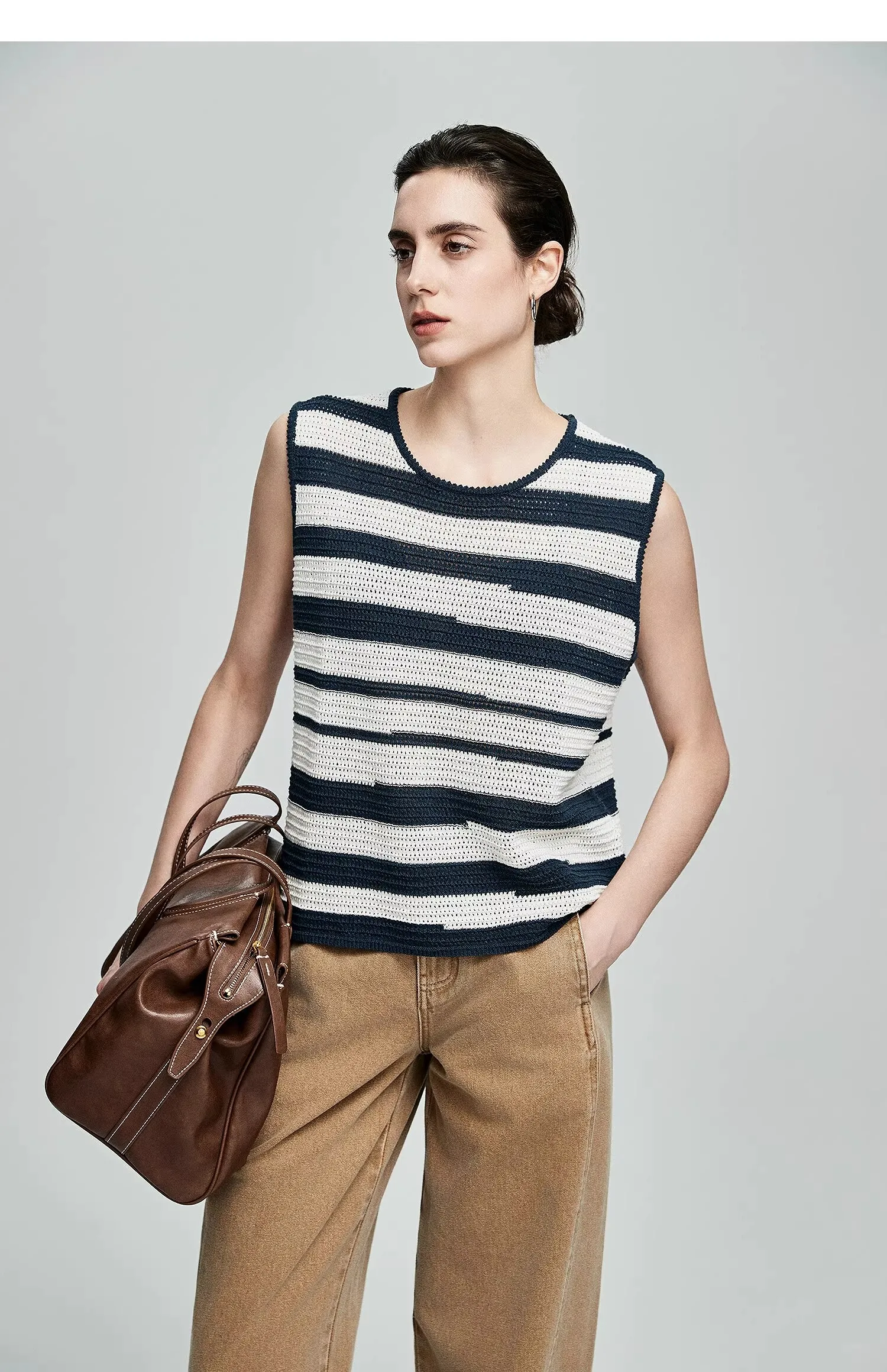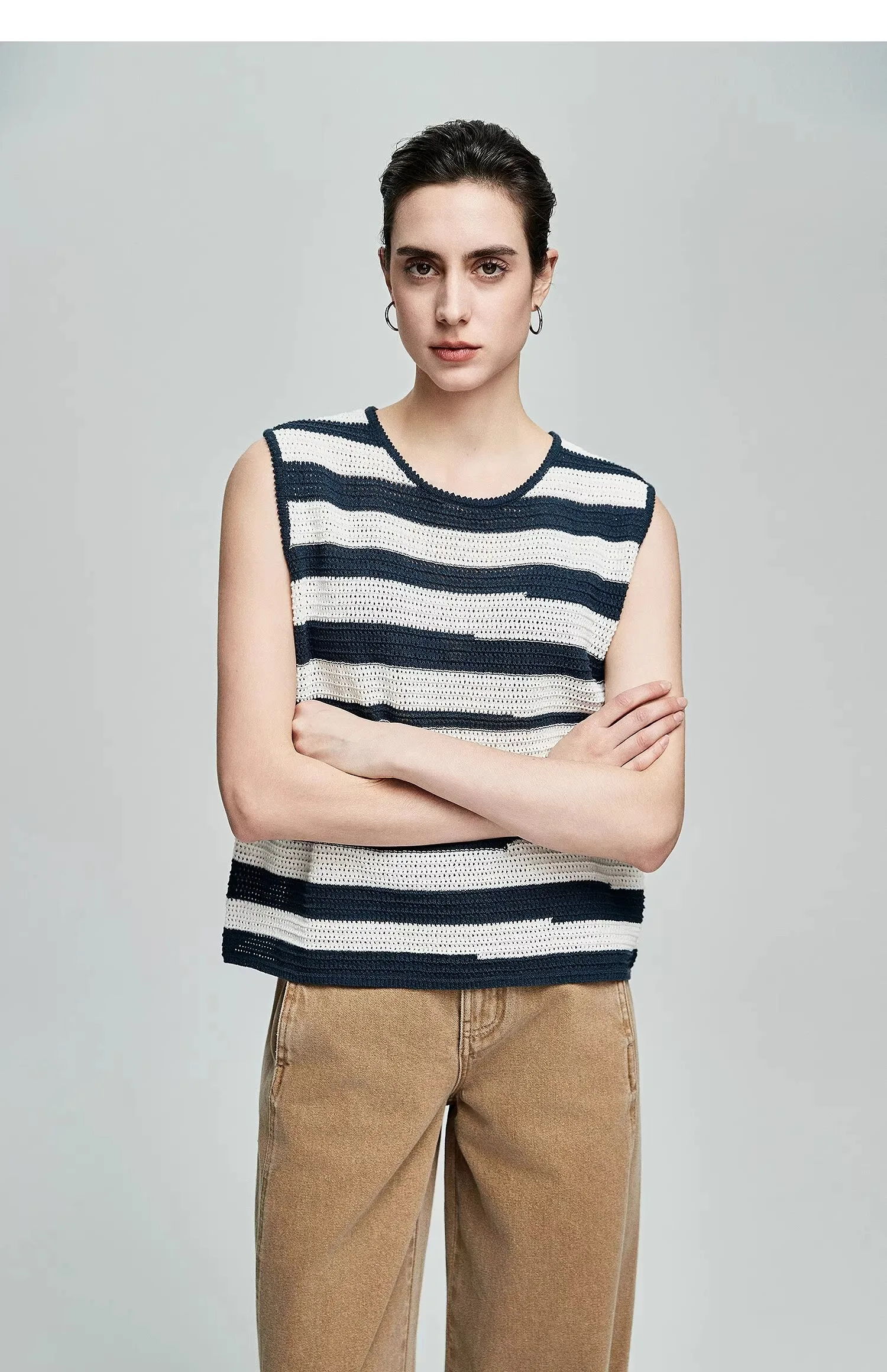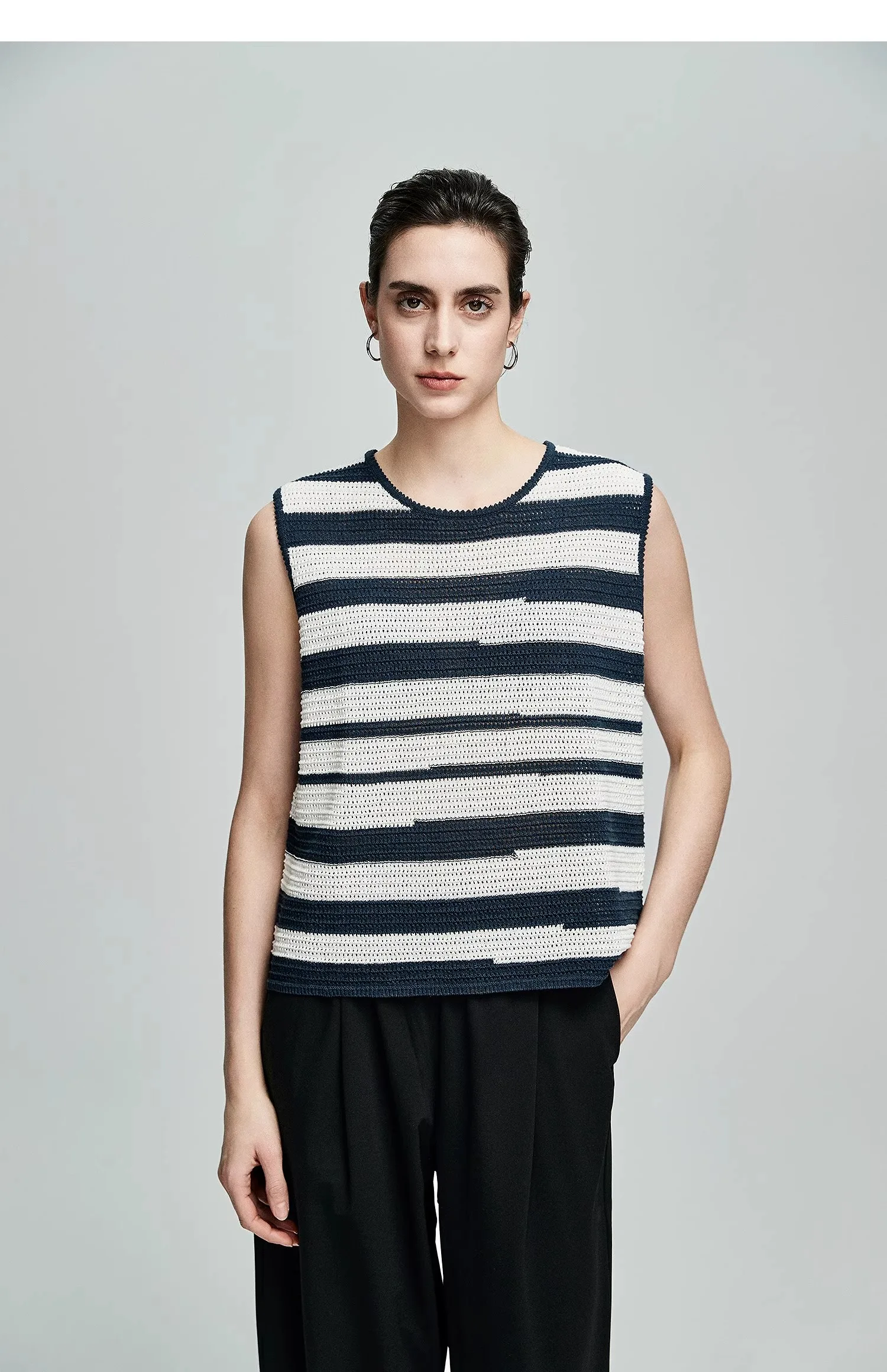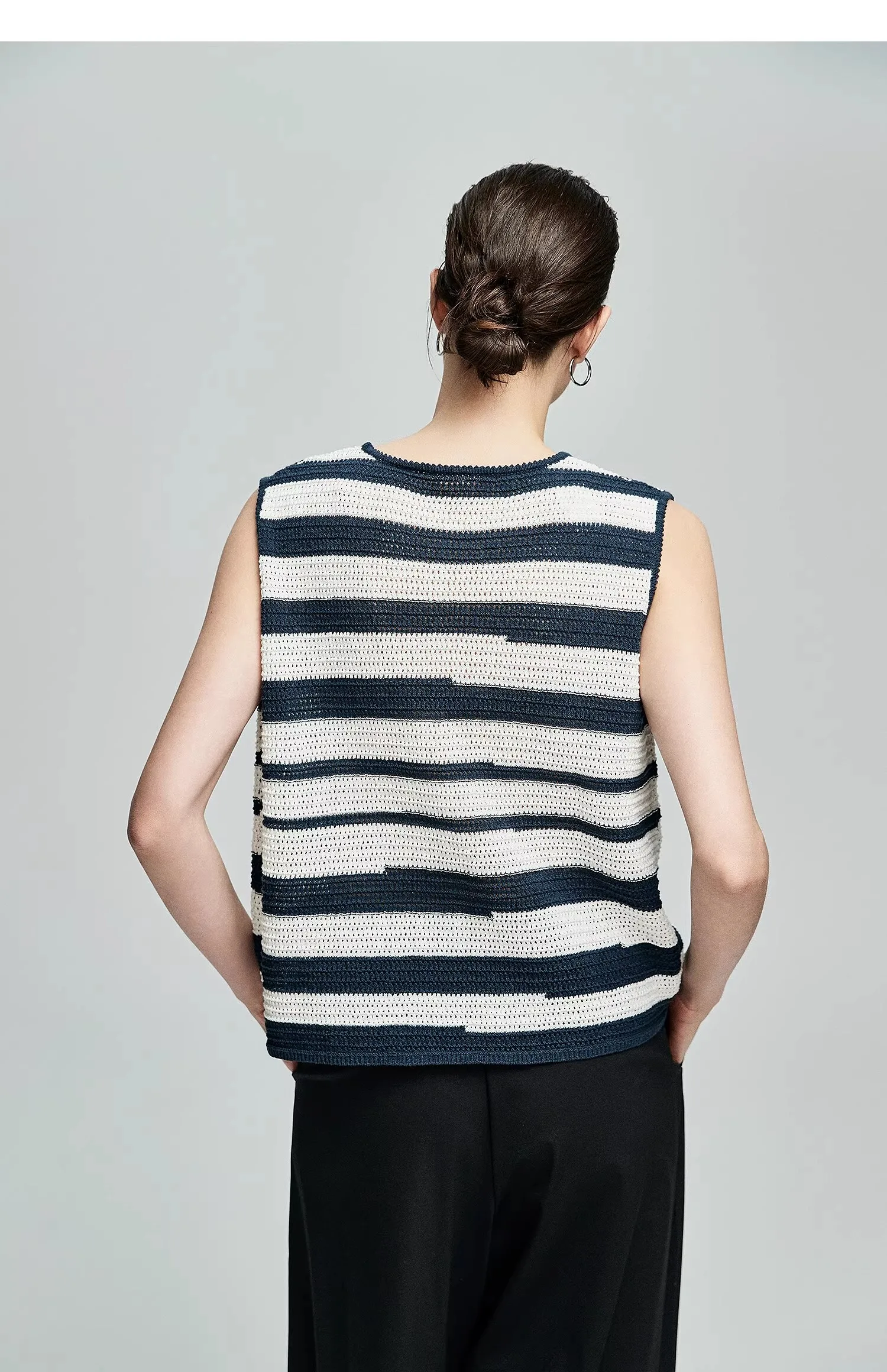 Cotton and linen Sleeveless Loose vest female New products for Spring/Summer 2025 Striped knitted top Hollowed-out design