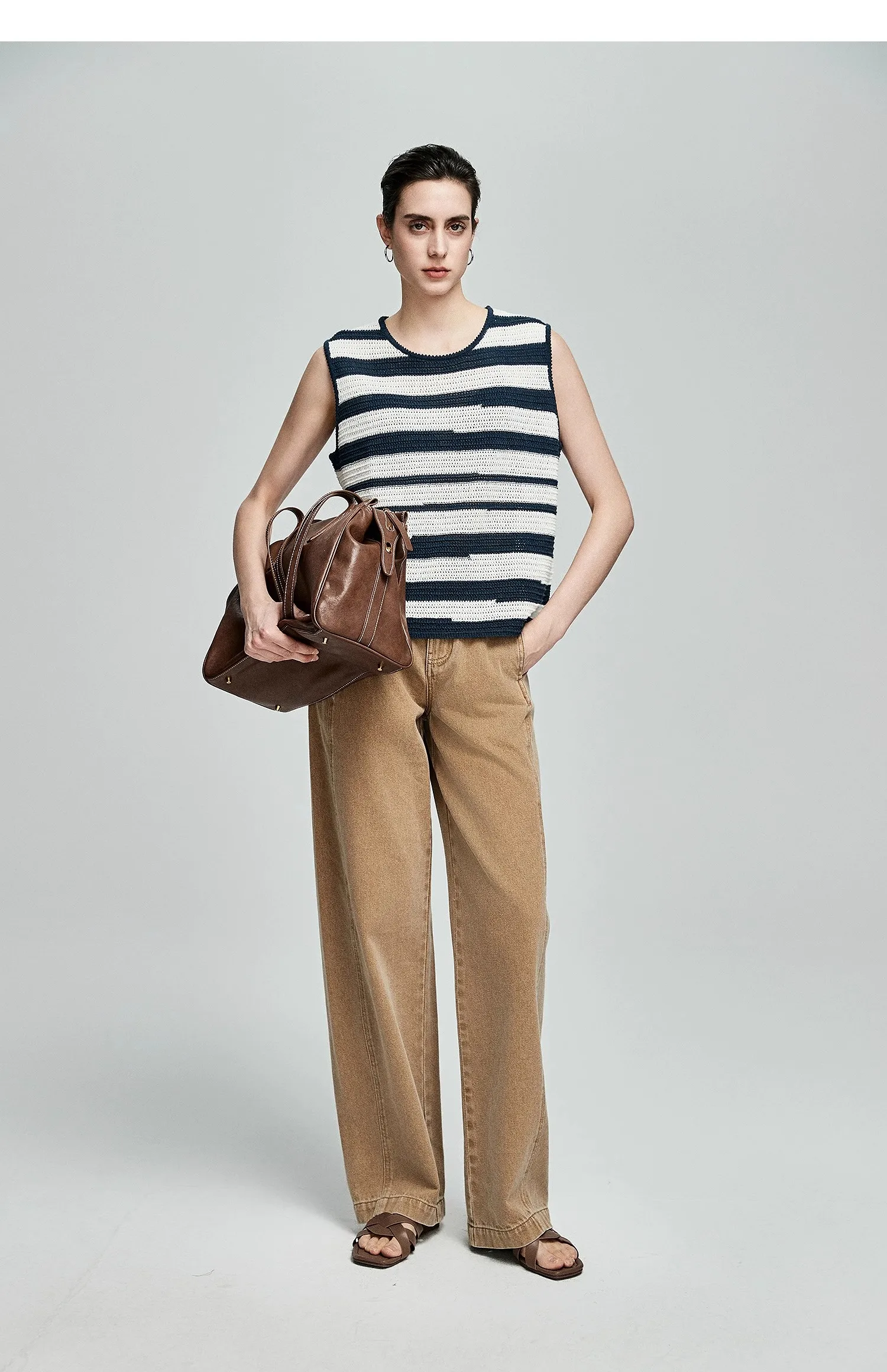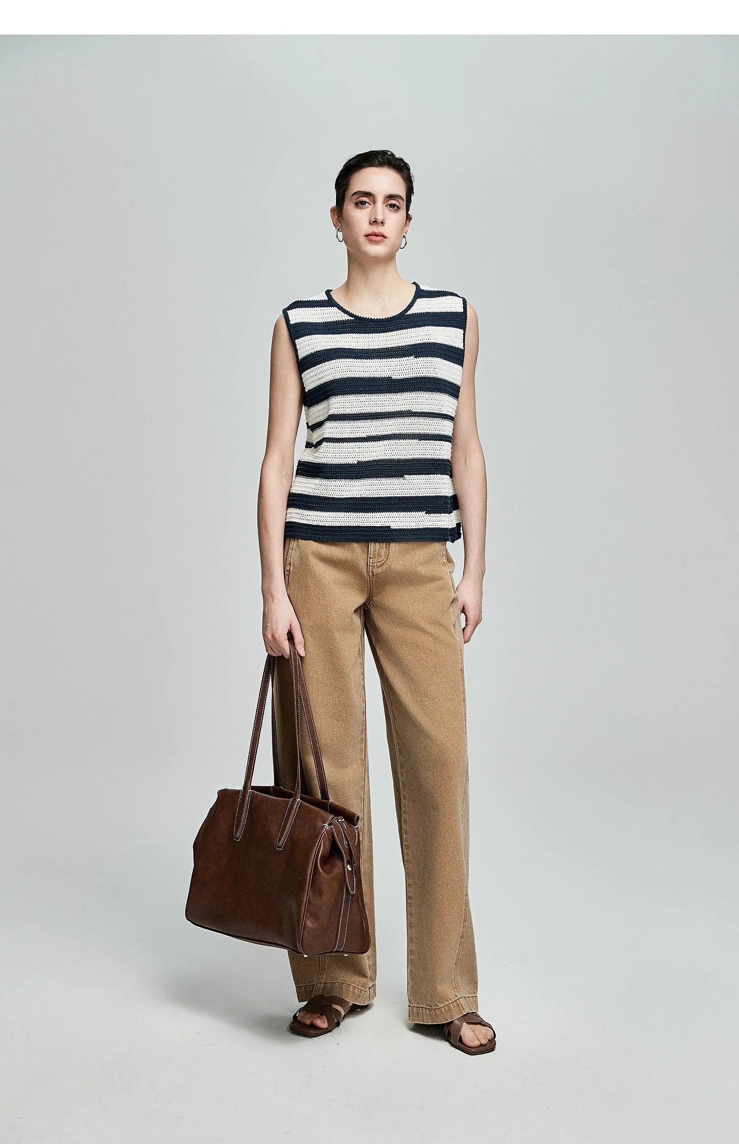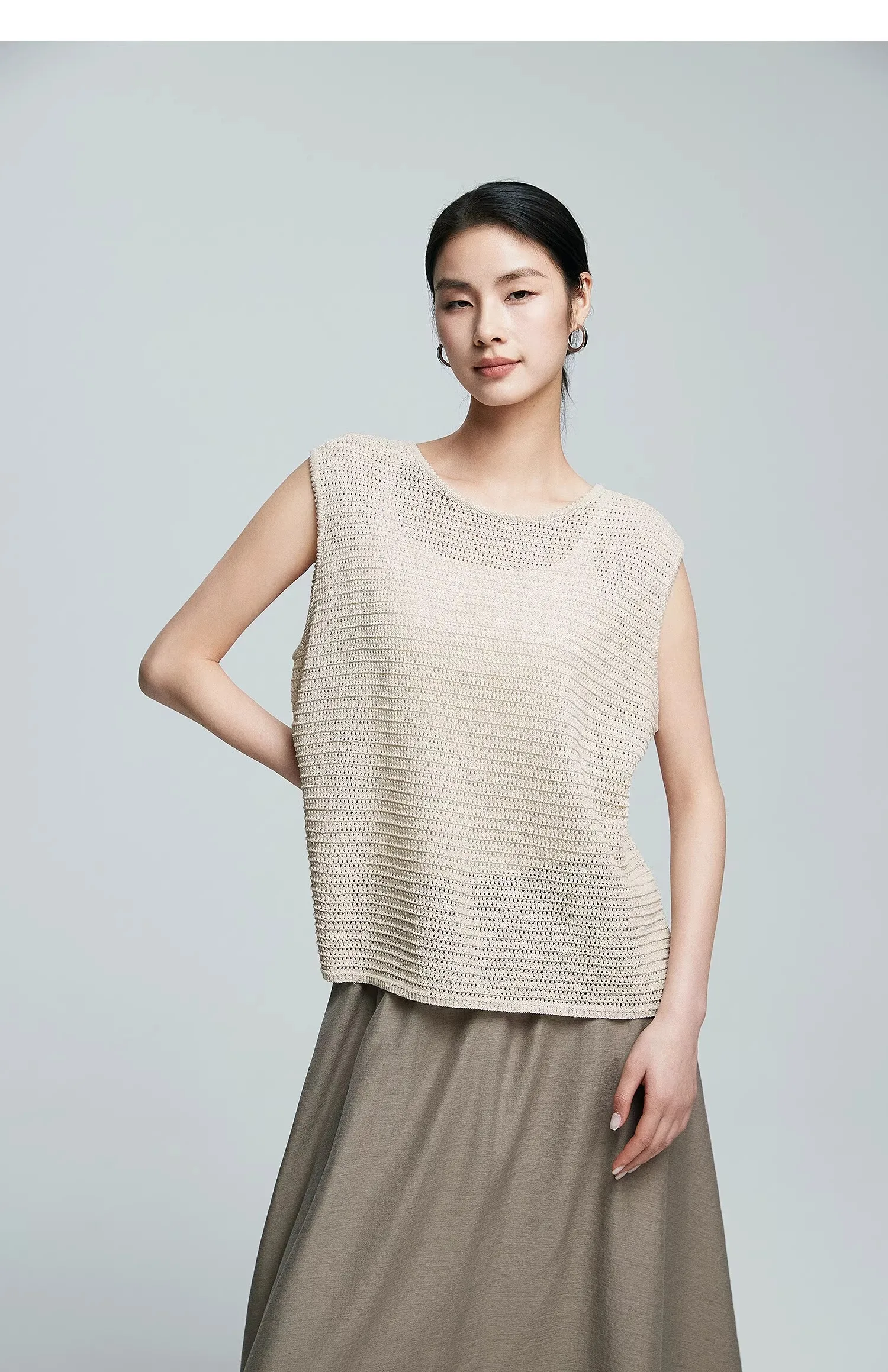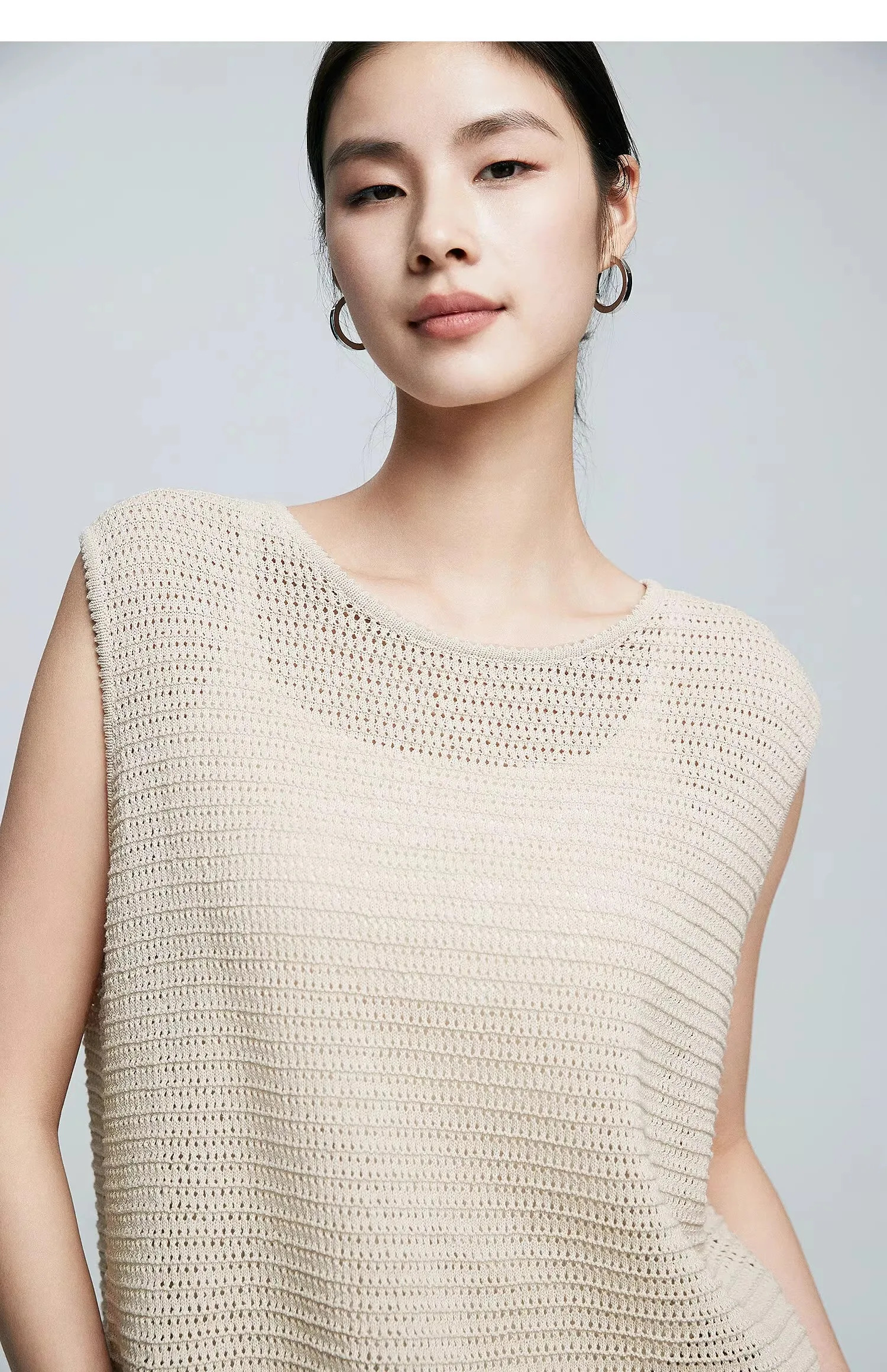Cotton and linen Sleeveless Loose vest female New products for Spring/Summer 2025 Striped knitted top Hollowed-out design