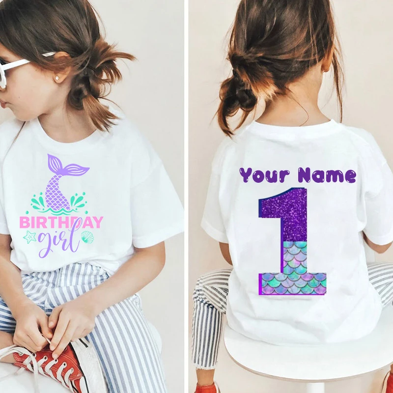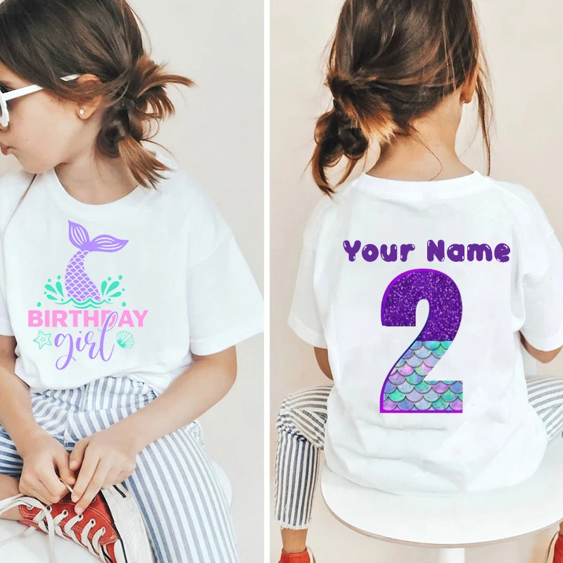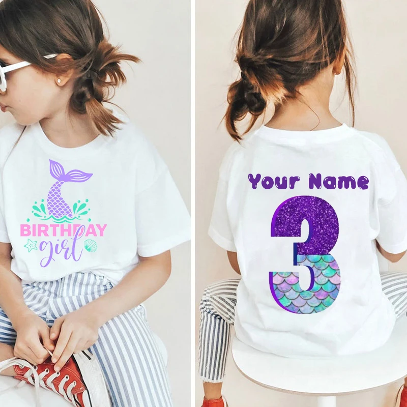 Custom Name Mermaid Birthday Girl Tshirt1-9yeas Kids Tshirt Birthday Party Gift Clothing Front Back Print Pattern Tshirt Tops