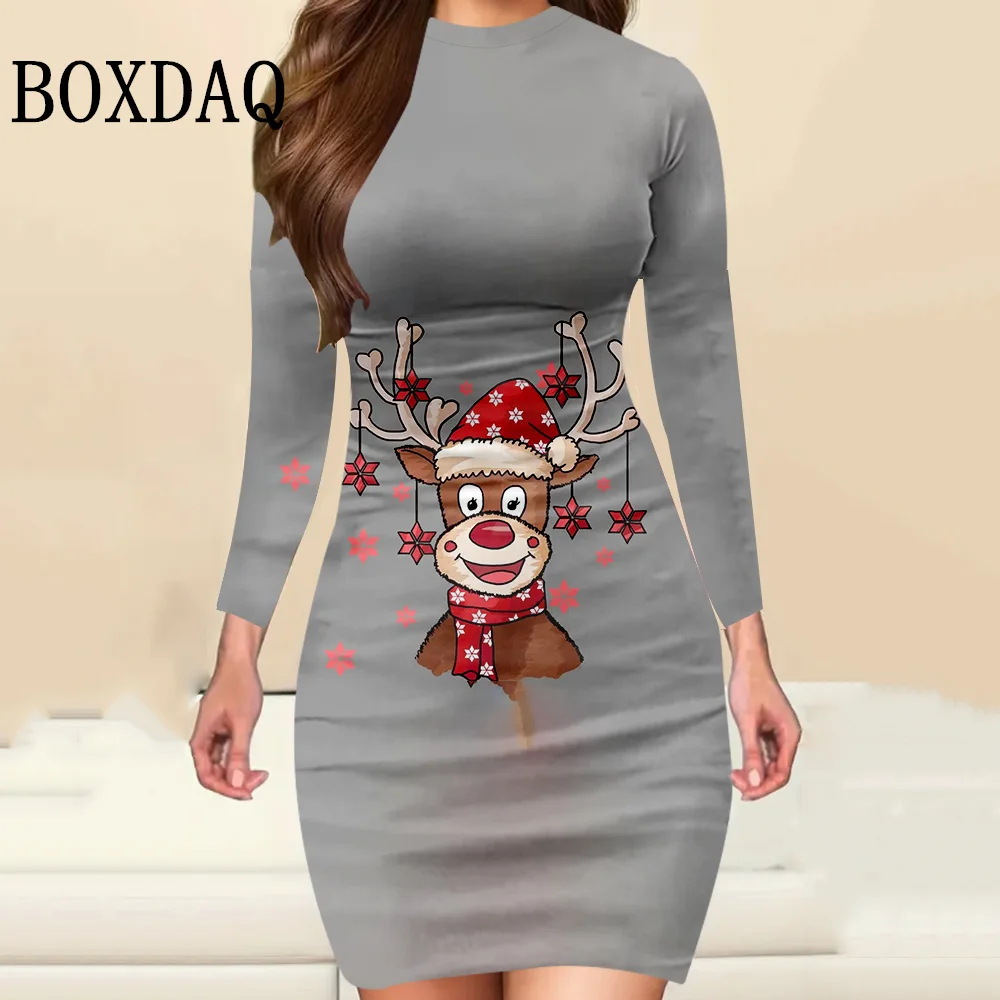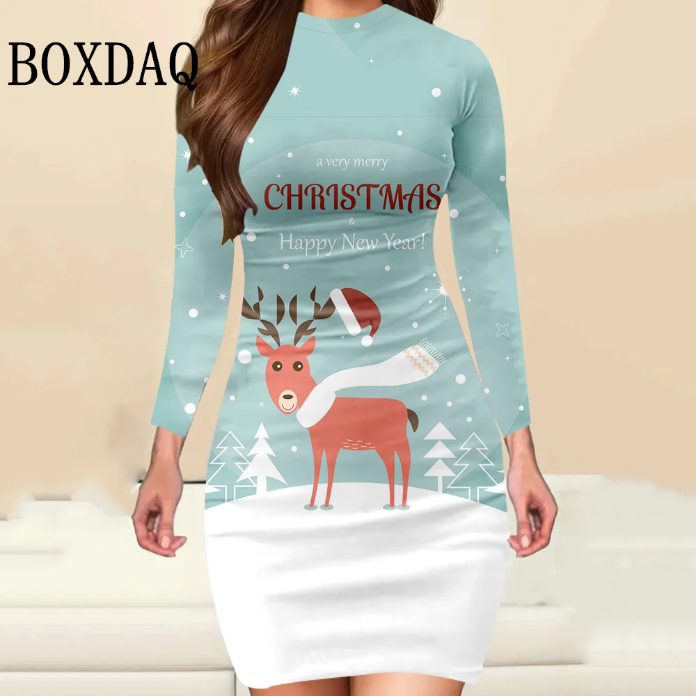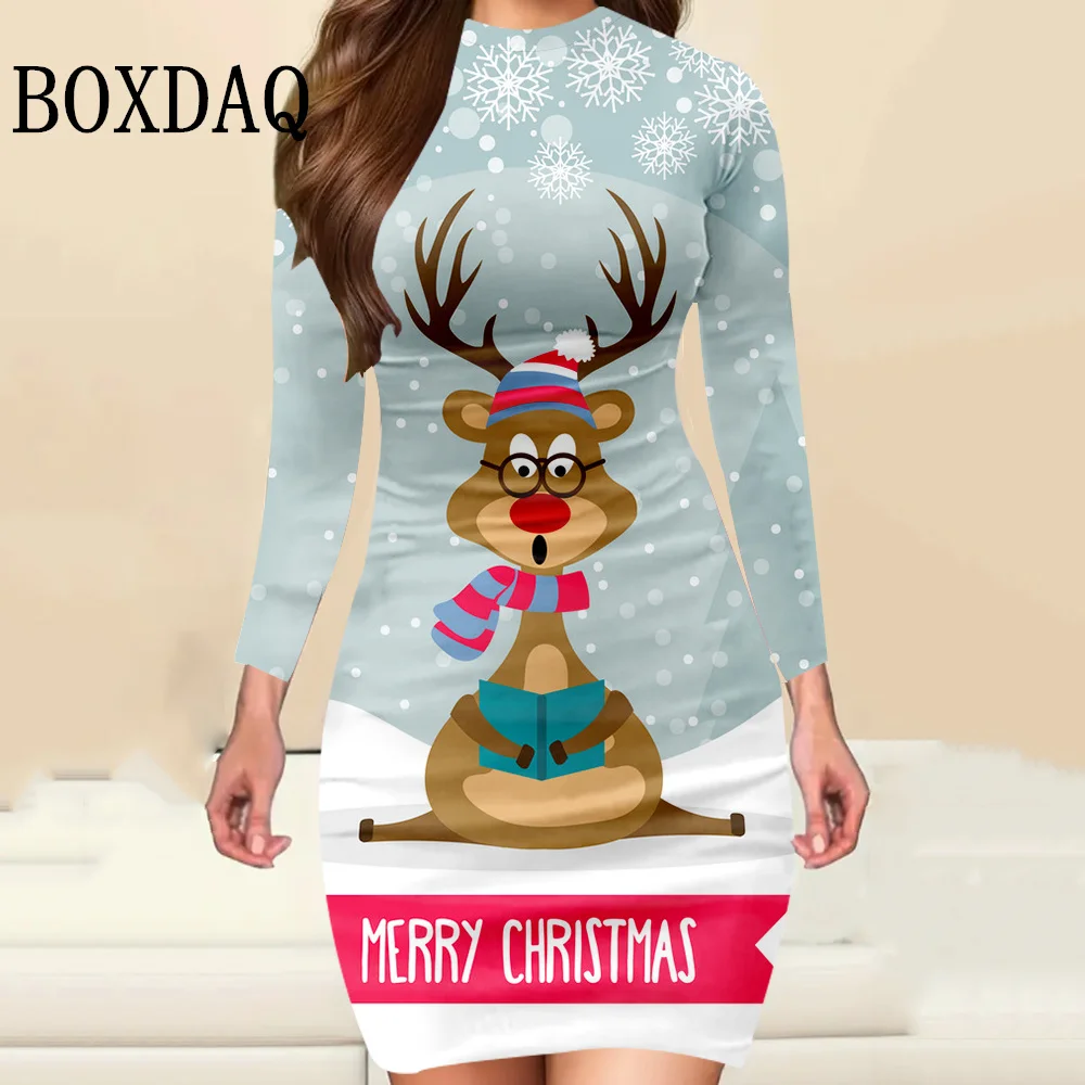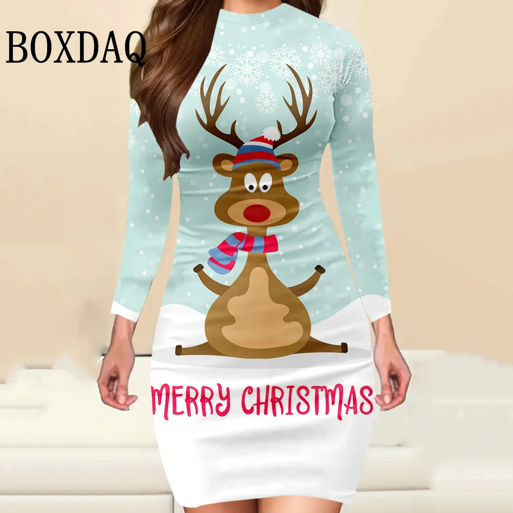 Cute Christmas Woman Dresses Elegant Dress Office Tight Slim Lady O Neck Autumn Winter Casual Cartoon Print Mini Dress Vestidos