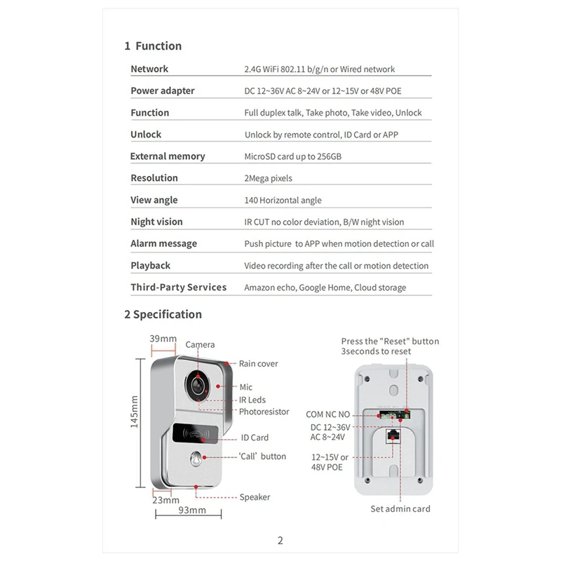 Function:Full duplex talk,Takephoto,Take vido,Unlock