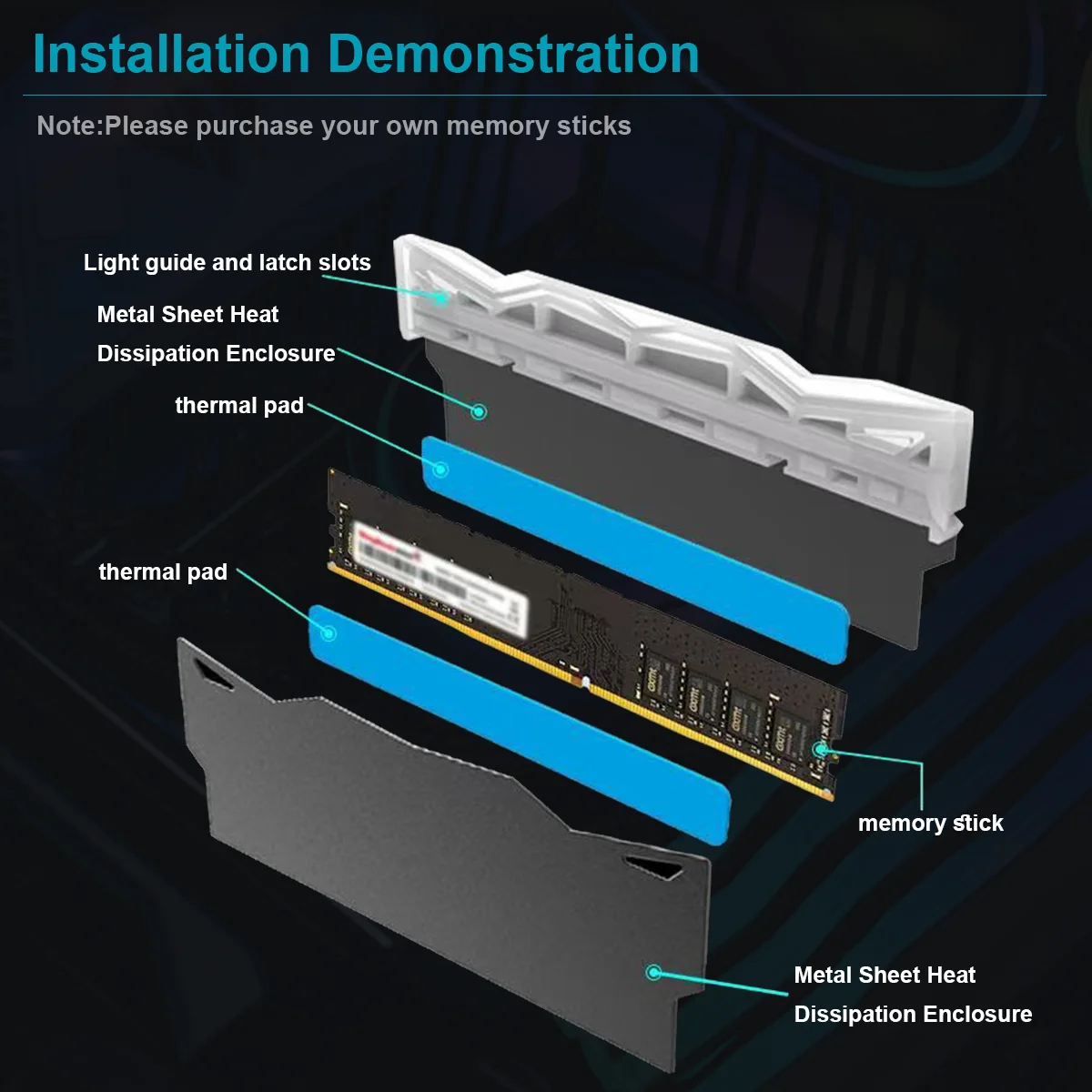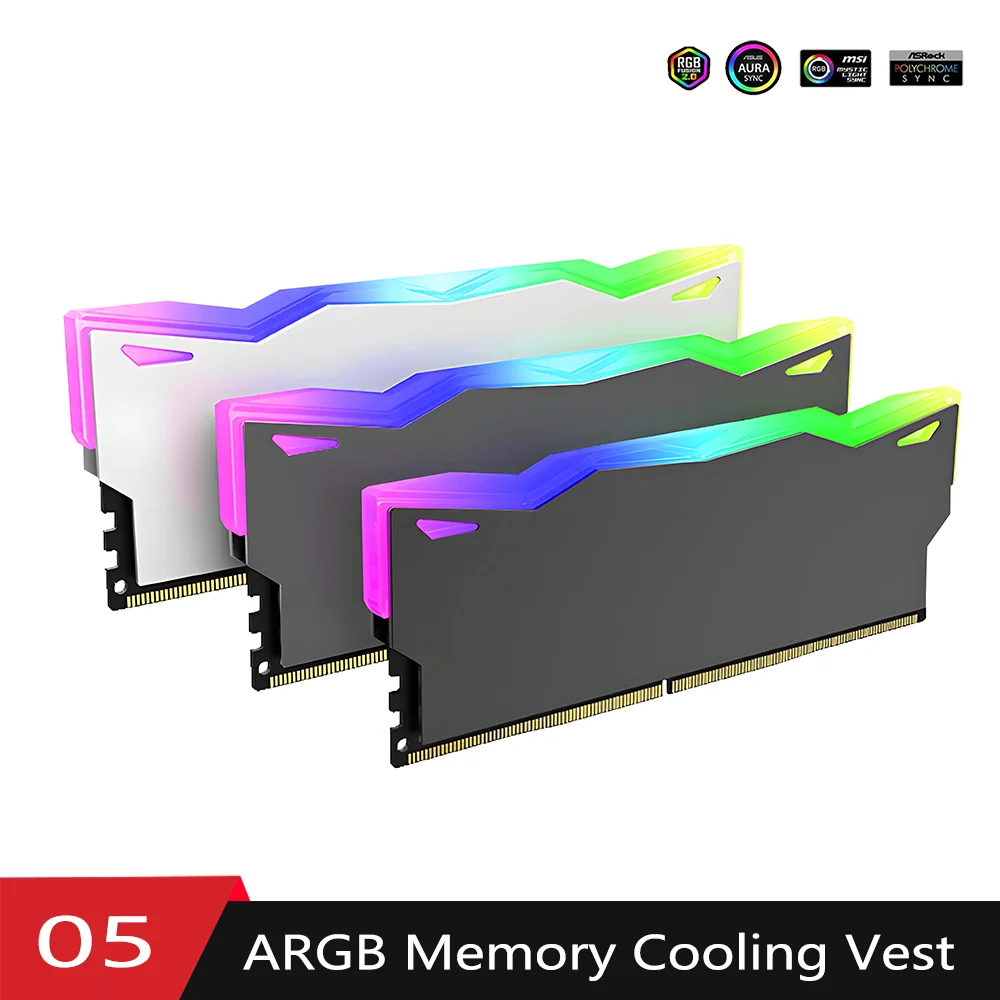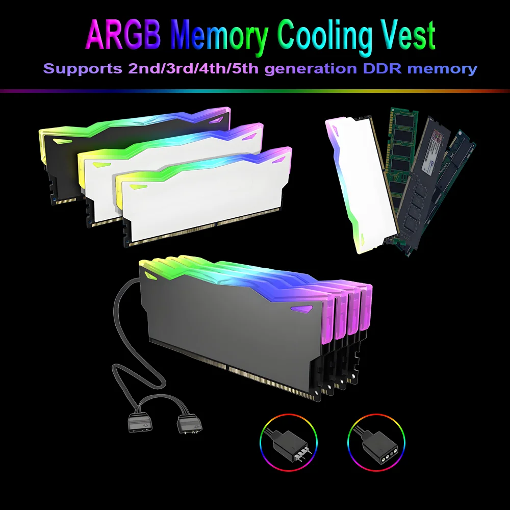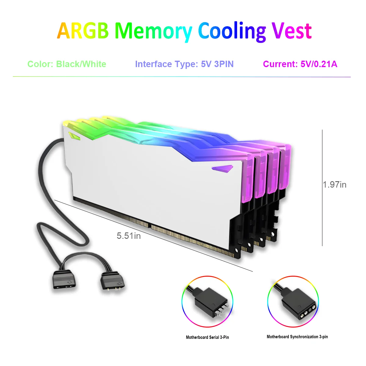 DDR Memory Cooler 5V-3PIN ARGB Memory Cooler, Aluminium Alloy with Thermal Silicone Pad for DDR5 DDR4 DDR3 DDR2 Desktop Compute