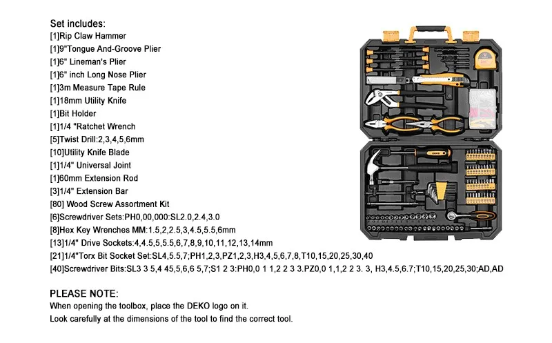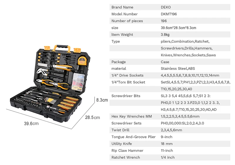 DEKO Home DIY Tool Kit Car Repair 196 pieces Combination Tool Kit Manual Tool Kit with Plastic Tool Kit Screwdriver Hammer