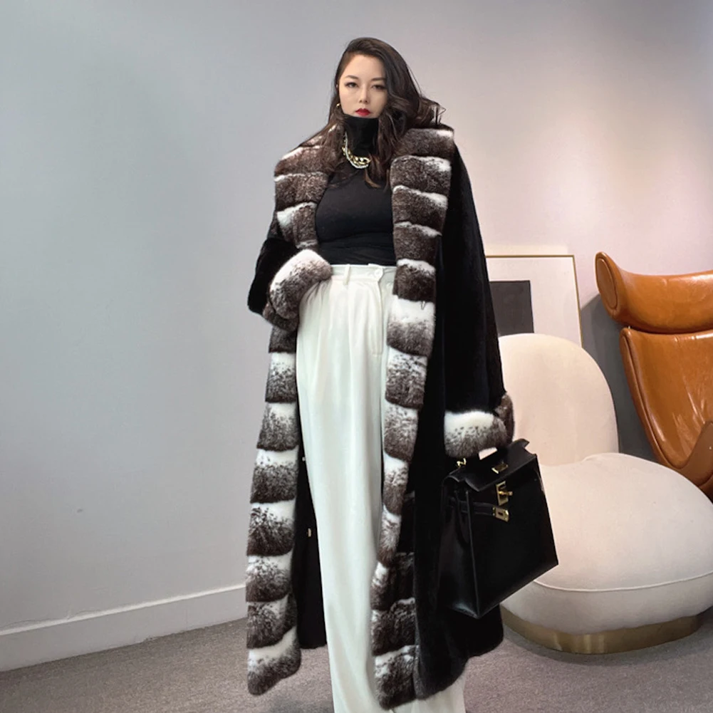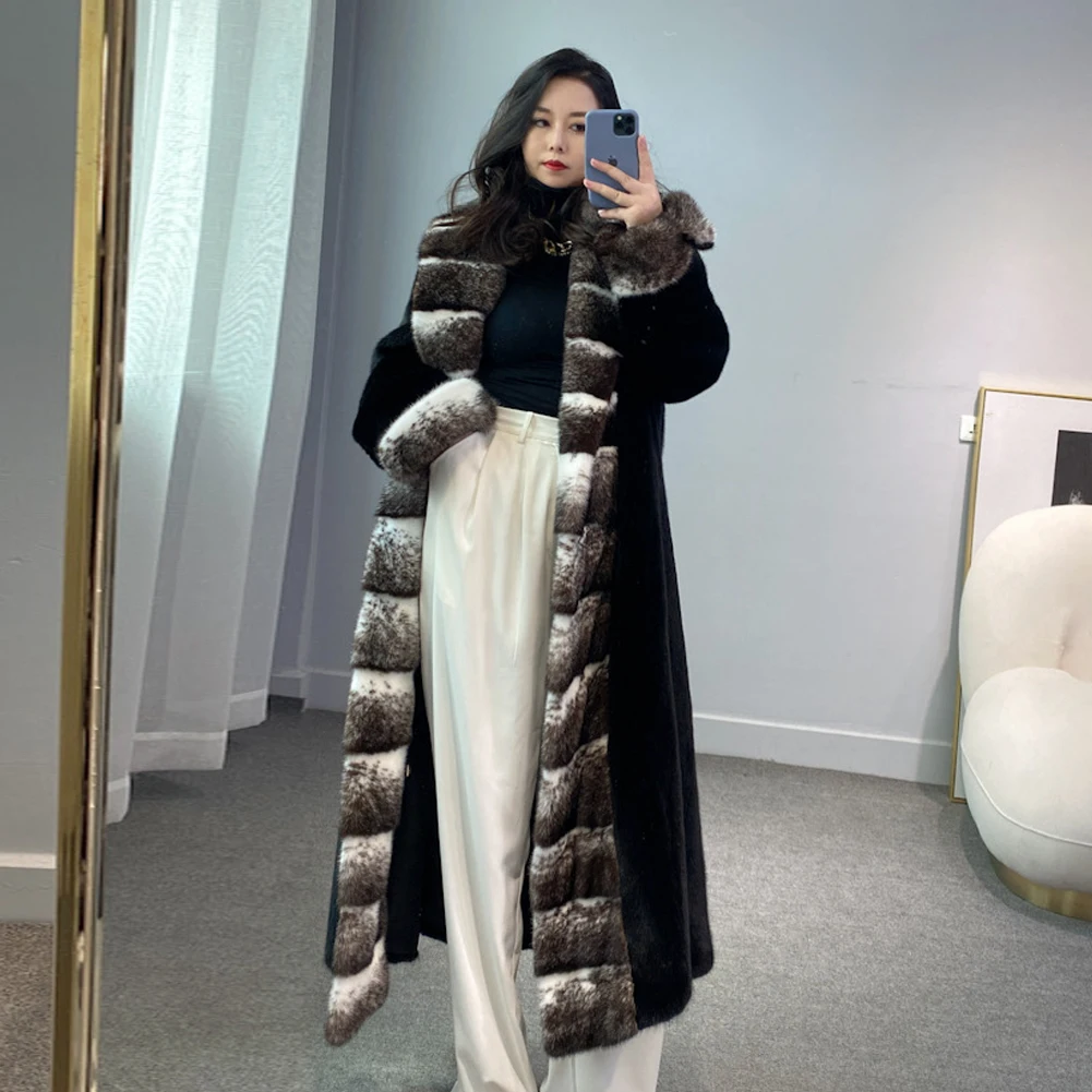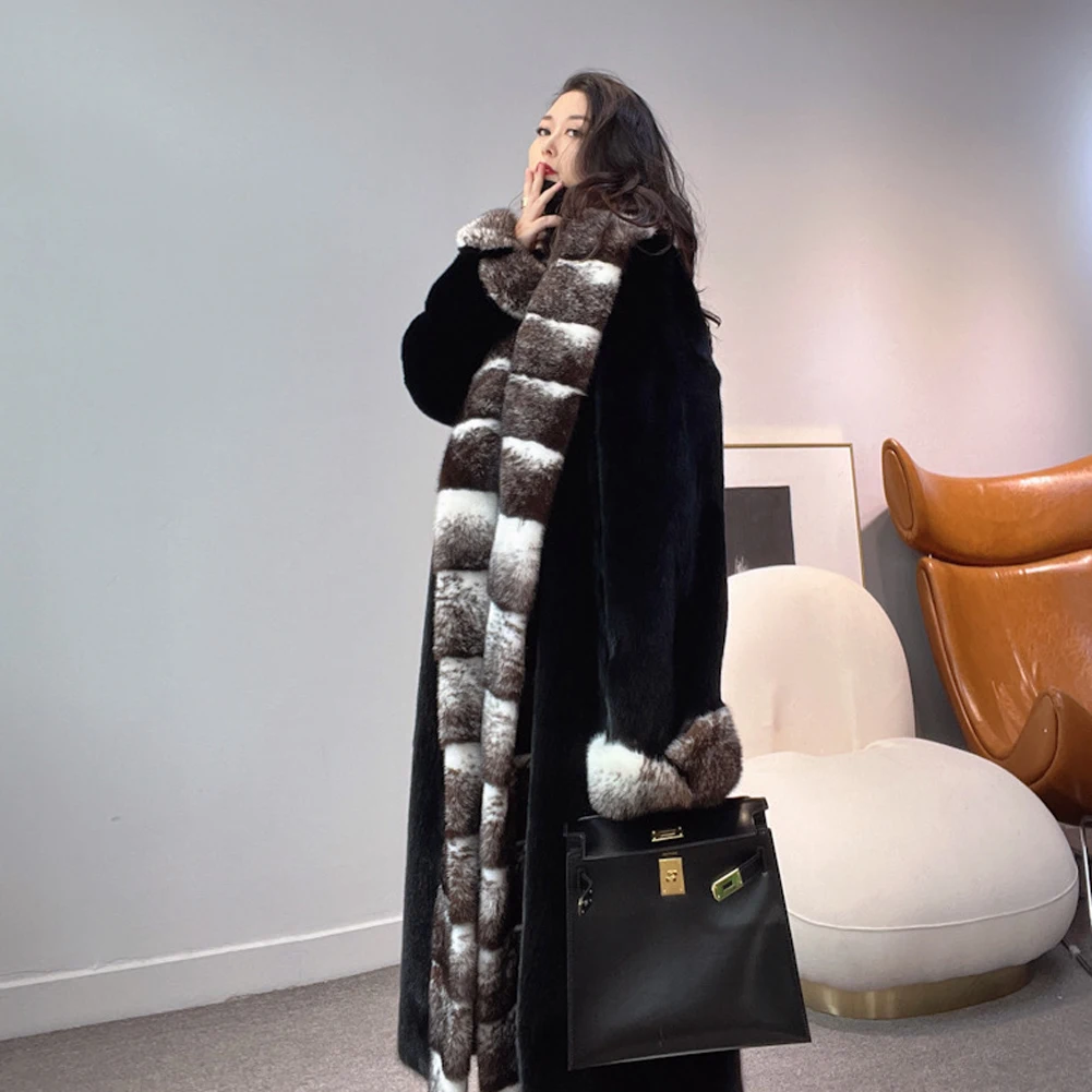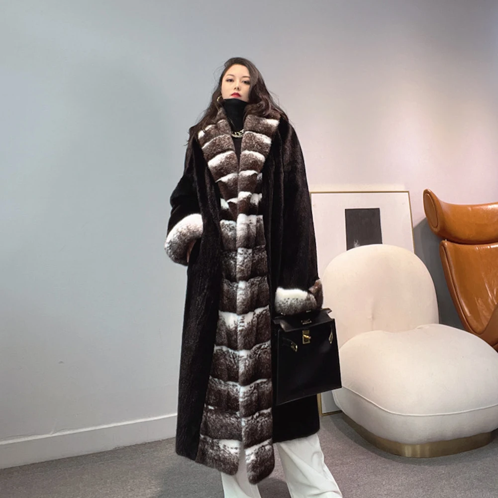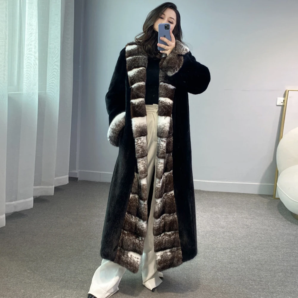 Denny&Dora Women’s Mink Fur Coat Black Fur Coat Long Coat With Big Lapel Collar