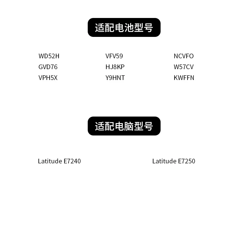 Compatible Dell Part Numbers: 0W57C 451-BBFW 451-BBFX 451-BBQD DWJHM F3G33 FW2NM GD076 GHT4Compatible Dell Part Numbers: 0W57C 451-BBFW 451-BBFX 451-BBQD DWJHM F3G33 FW2NM GD076 GHT4X GVD76 HJ8KP J31N7 JN0J1 KKHY1 KWFFN NCVF0 VFV59 W57CV WD52H WG6RP YDN87 Fits with Dell Laptop Model Numbers: Dell Latitude E7240 Battery Dell Latitude E7250 Battery Dell Latitude 7240 Ultrebook Battery Dell Latitude 7250 Ultrebook BatteryX GVD76 HJ8KP J31N7 JN0J1 KKHY1 KWFFN NCVF0 VFV59 W57CV WD52H WG6RP YDN87 Fits with Dell Laptop Model Numbers: Dell Latitude E7240 Battery Dell Latitude E7250 Battery Dell Latitude 7240 Ultrebook Battery Dell Latitude 7250 Ultrebook Battery
