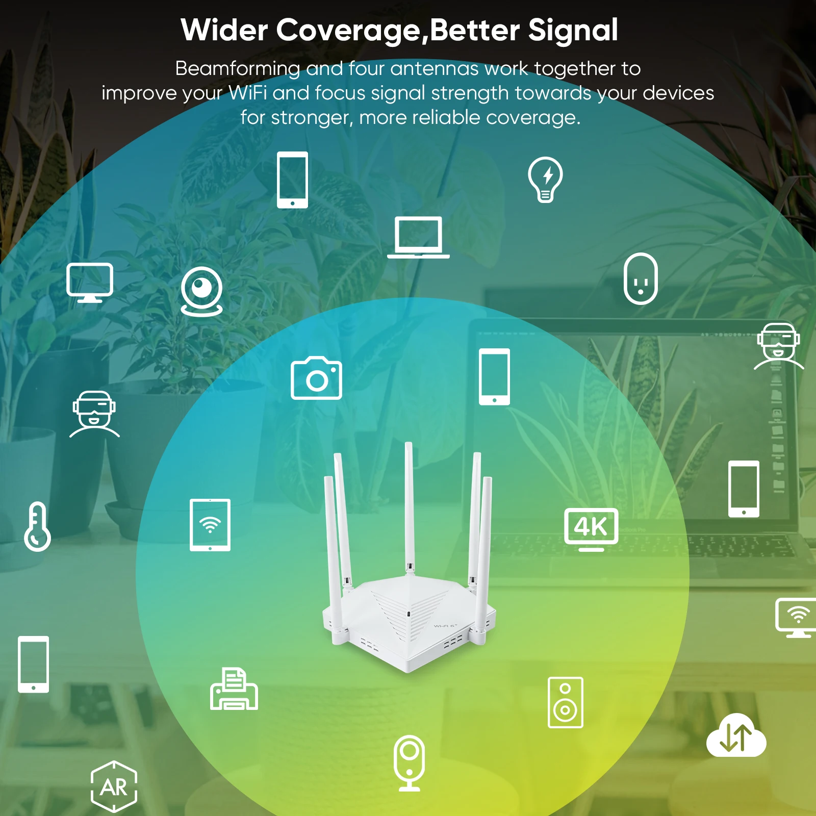 Beamforming and four antennas work together to improve your WiFi and focus signal strength towards your devices for stronger, more reliable coverage.