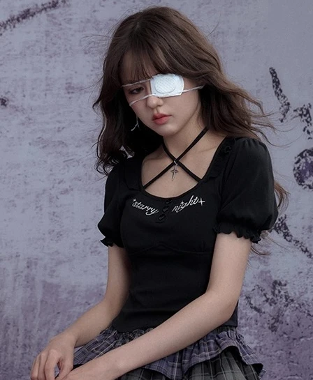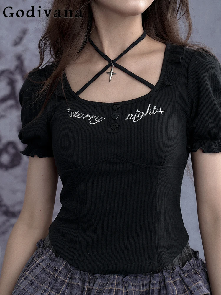 Elegant Girl Dark Halter Sweet Puff Sleeve Versatile Summer New Top Cute Slim Short Sleeve Square Neck Black Embroidered T-Shirt
