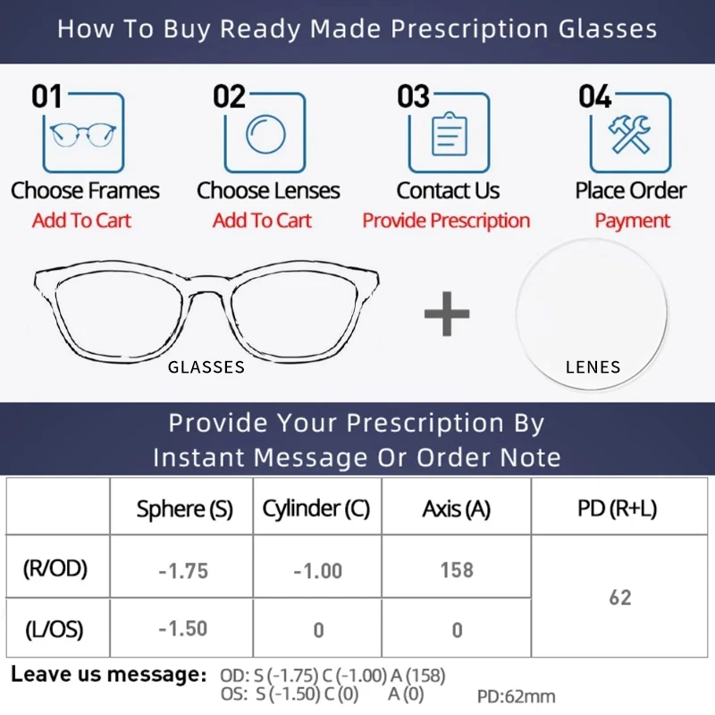 If you require lenses with additional features or thinner lenses (1.61/1.67/1.74), please add the frame to your cart first, then click on the lens image below to add the lenses to your cart and purchase them together~