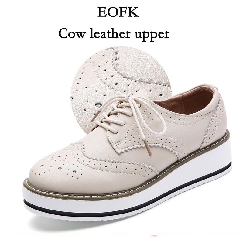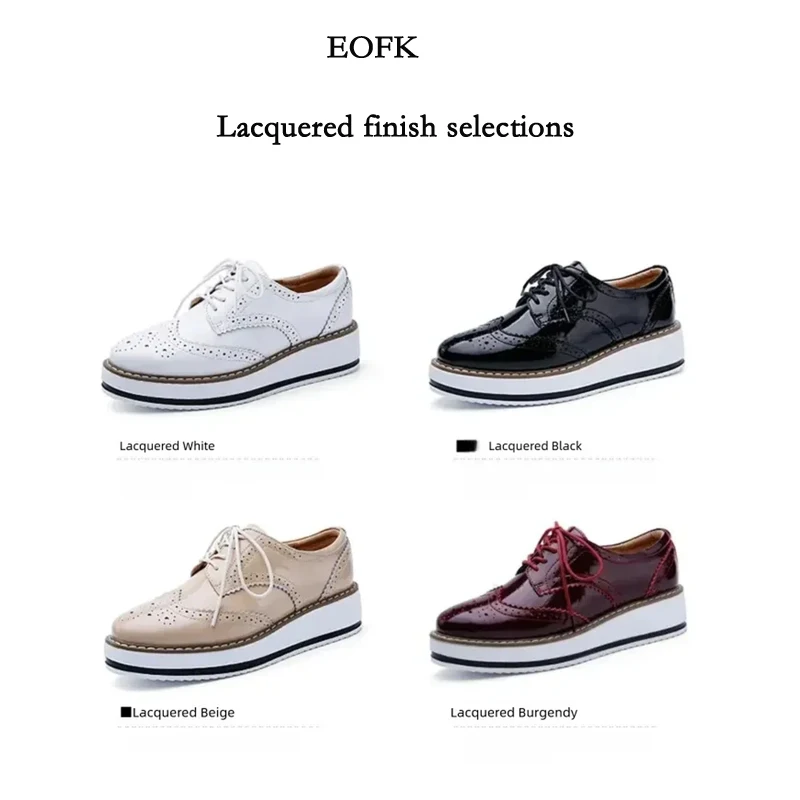 EOFK Spring Autumn Women Oxford Flats Genuine Leather Wingtips Lace Up Comfort Lady Brogue Derby Patent Platform Casual Shoes