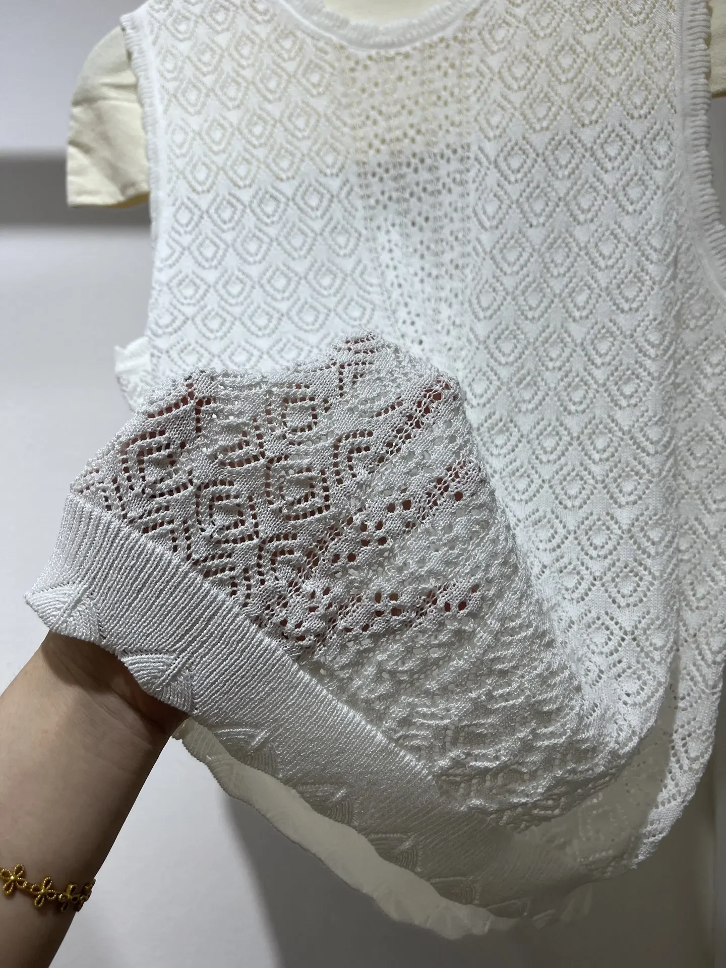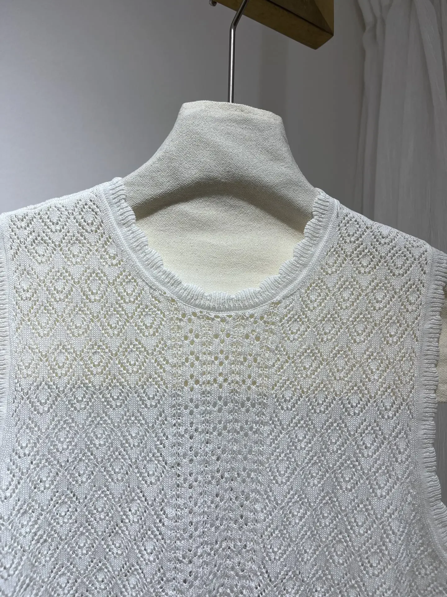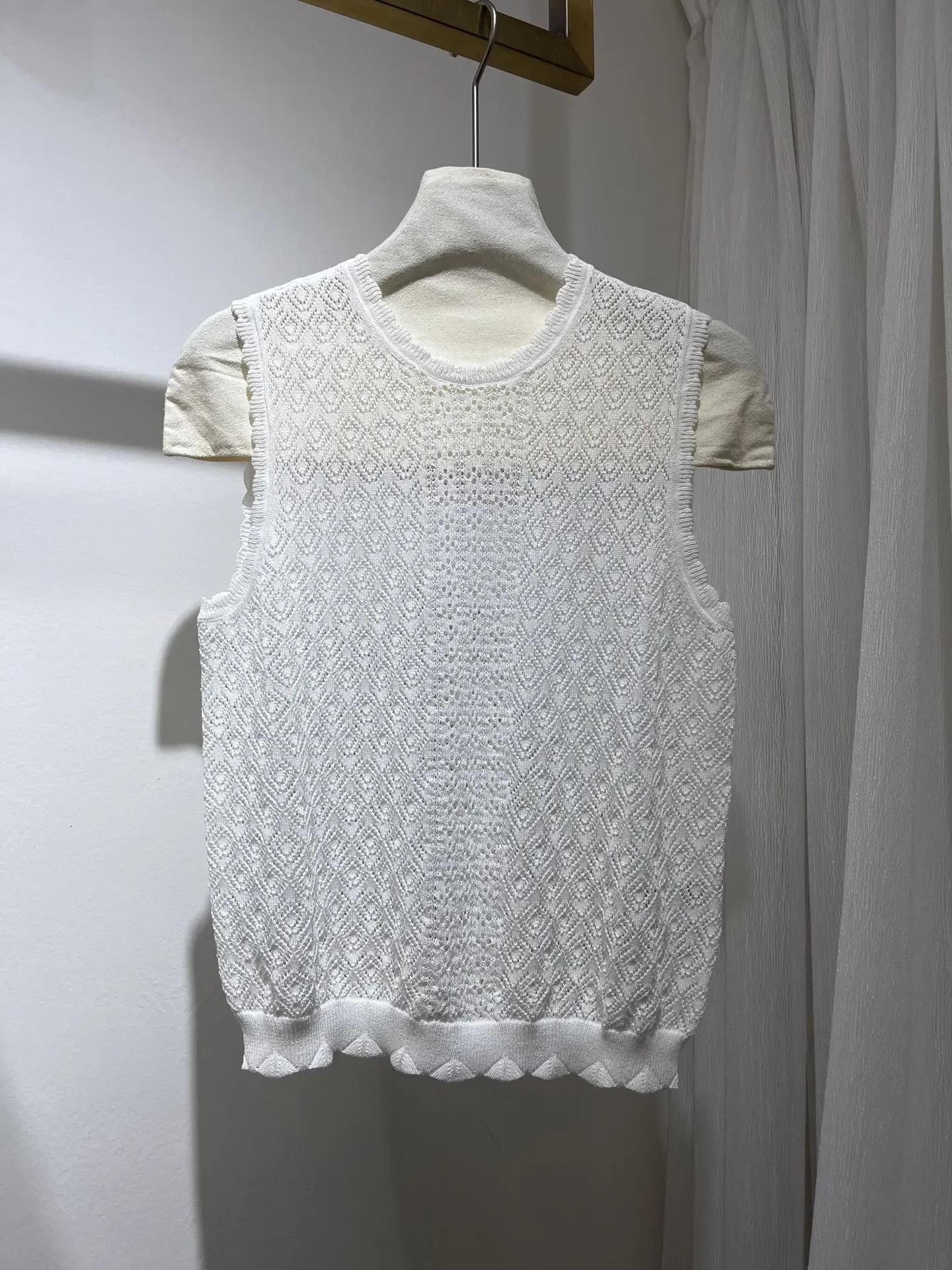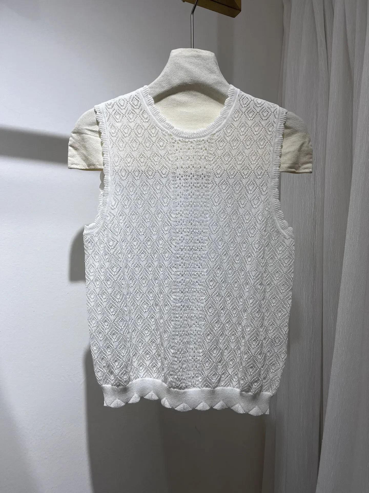 Geometric Hollow Out Women White Knitted Vest Round Neck Sleeveless Casual Female Tank Tops
