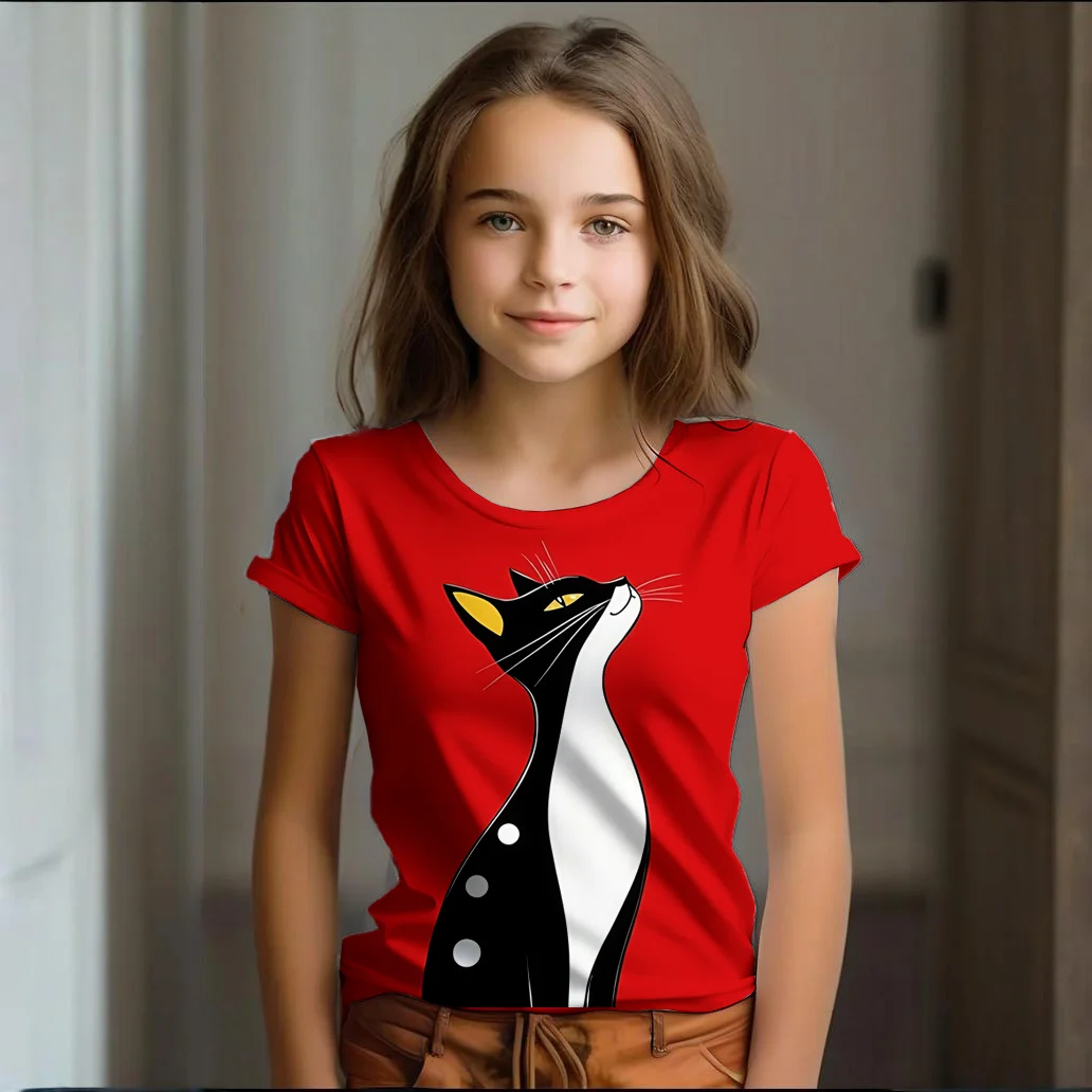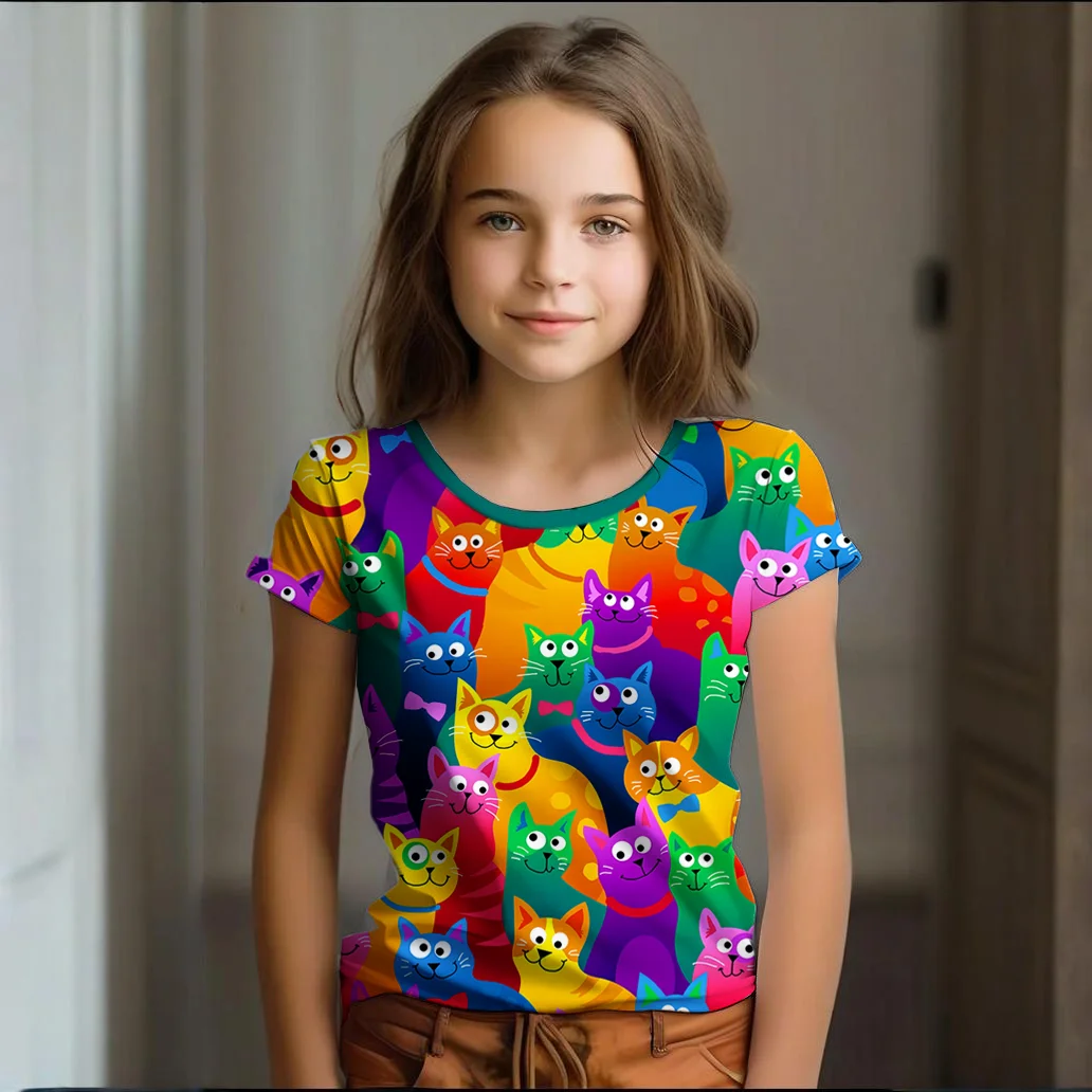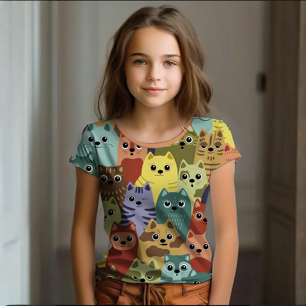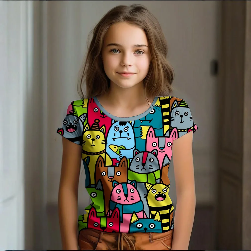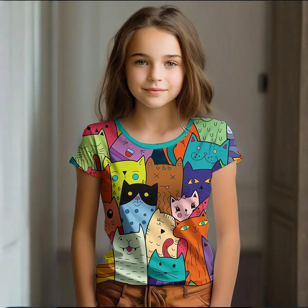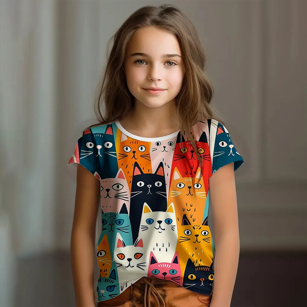 Girl Clothes Summer Cartoon Cat Graphic Children’s Clothing Kids Art Doodling Short Sleeve T Shirt Causal O-Neck Children Top