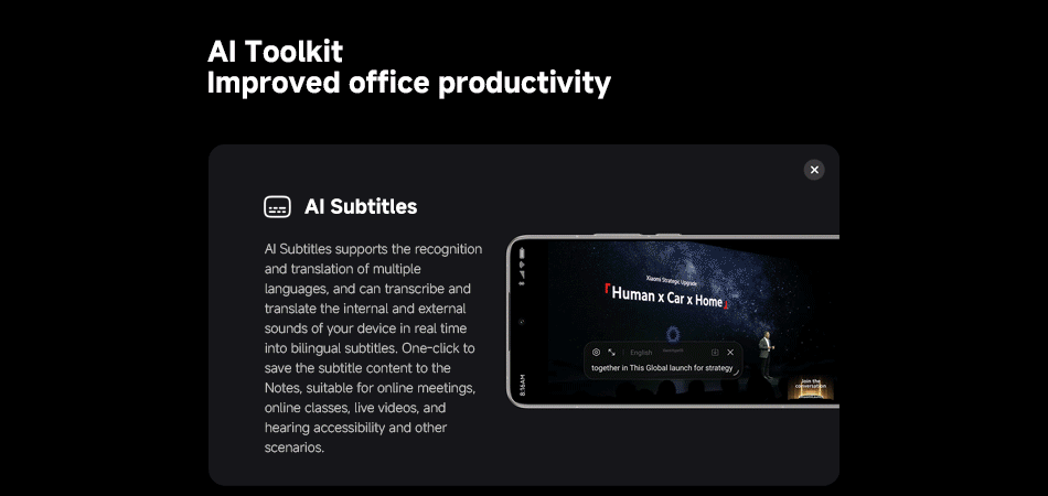 AI features————Circle to Search with Google, Google Gemini. (AI Interpreter, AI Notes, AI Recorder, AI Subtitles, AI Film, AI image editing, AI Portrait.)
