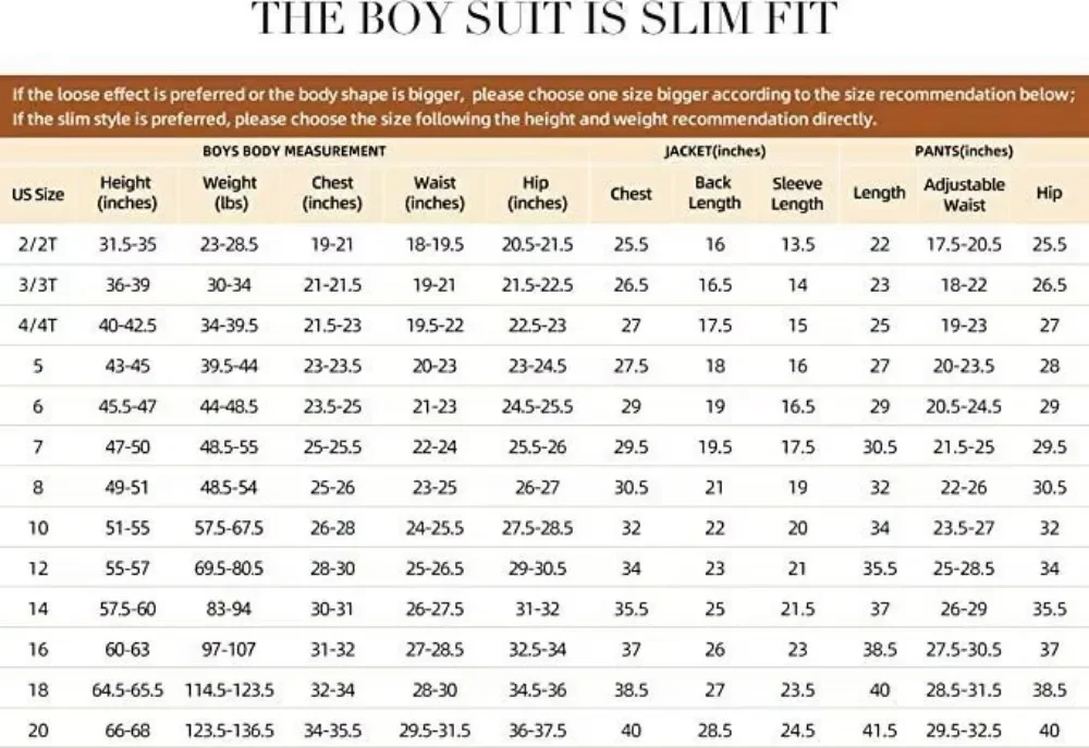 ⚪Fit Rules All: Please refer to our image size chart for the best size and fit. Our boys' first class slim suits may run a tad smaller due to it's tailored fit. Evey Suit Includes: A Slim Fit Blazer, Matching Fully Lined Vest and Matching Trousers. From the wedding halls to the streets. An ideal fit for every occasion. Shirt and Tie are NOT included.